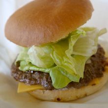 バンズの間に、プロセスチーズ、大き目のビーフパティ、レタス、トマト、そして豆乳マヨネーズを挟んでいる。