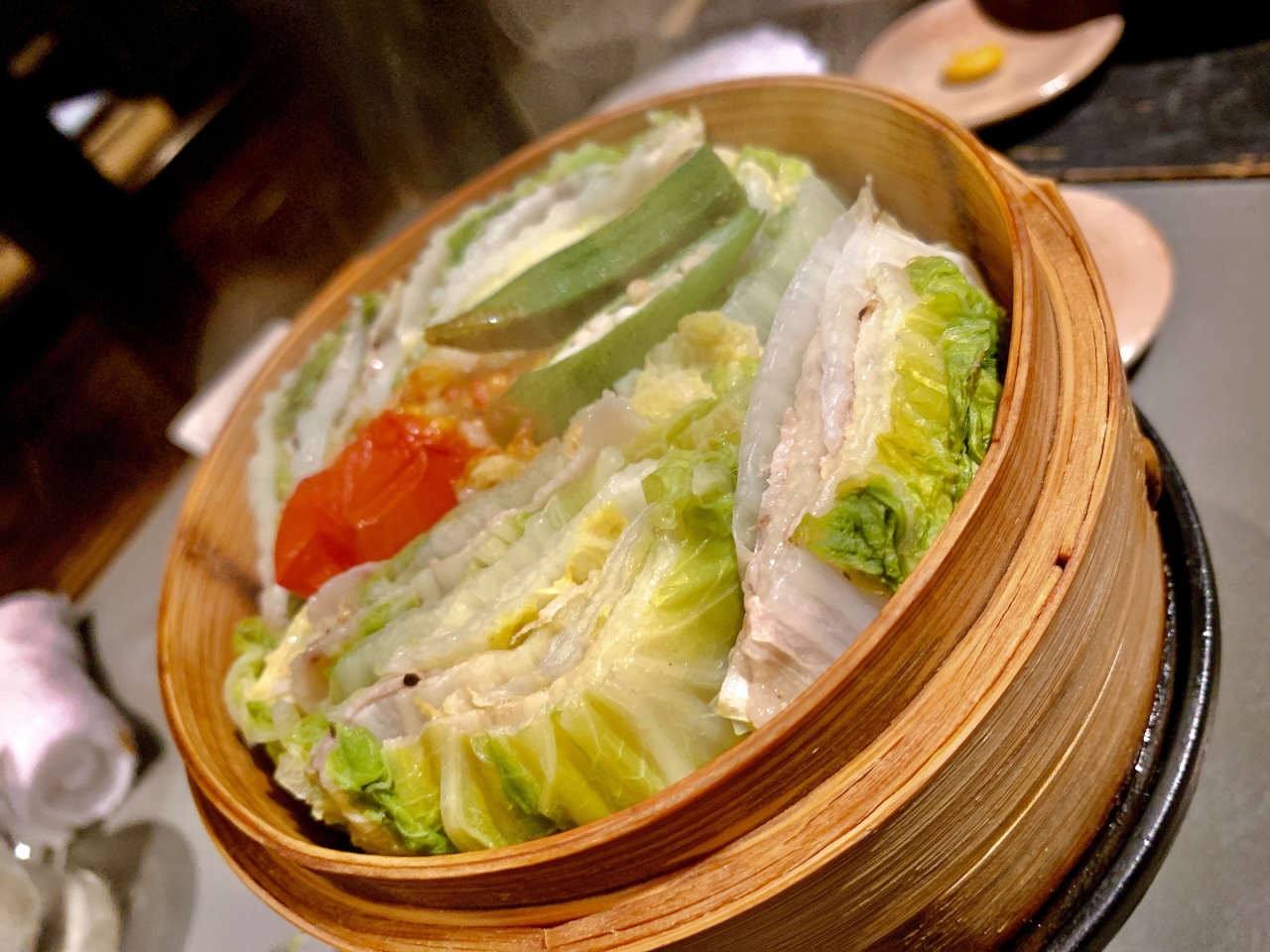 「豚肉と白菜のミルフィーユ」→セイロに隙間なく敷き詰められた豚肉を白菜が熱々に蒸されて配膳されてきます!特性ポン酢タレであっさりと頂けるとあって人気の逸品でしたね~