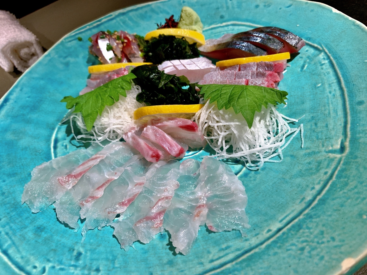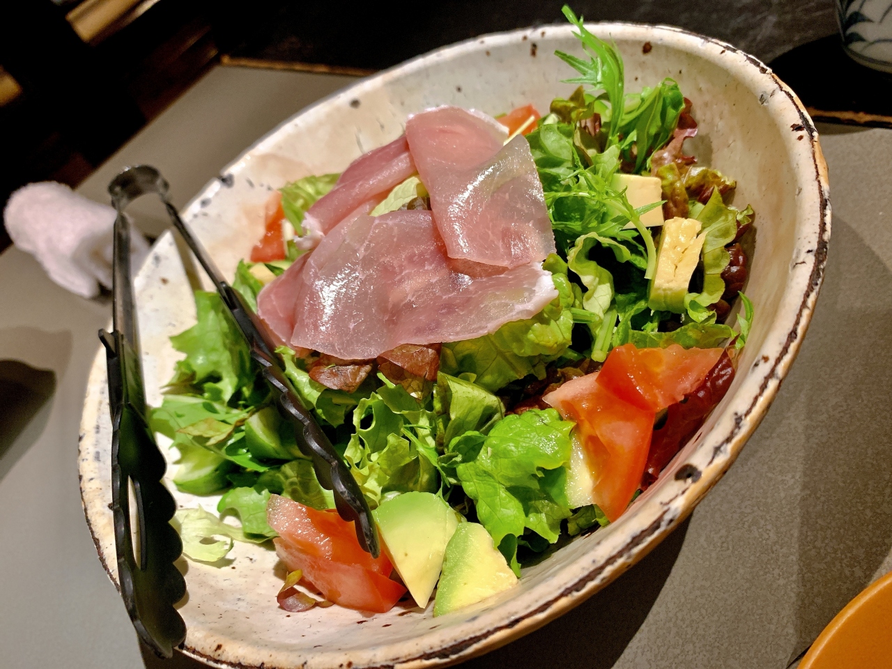 頂いたのはコース料理ですね~先ずは「付き出し」からビールで乾杯とスタートしてから「サラダ」「刺し盛り」と続いていきますよ・・・「刺し盛り」は玄界灘で取れた新鮮な魚で美味しかった。