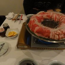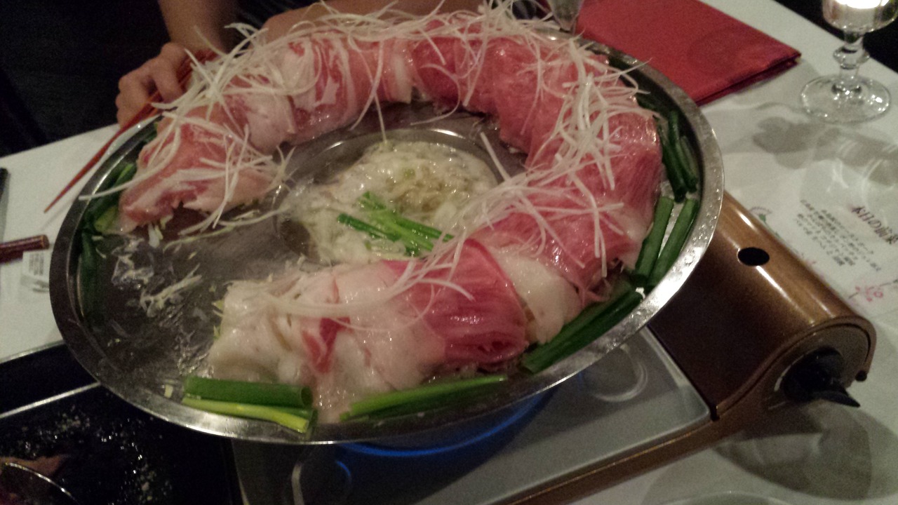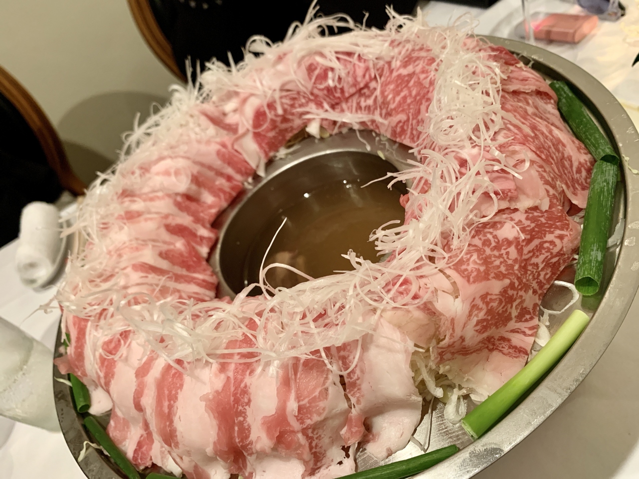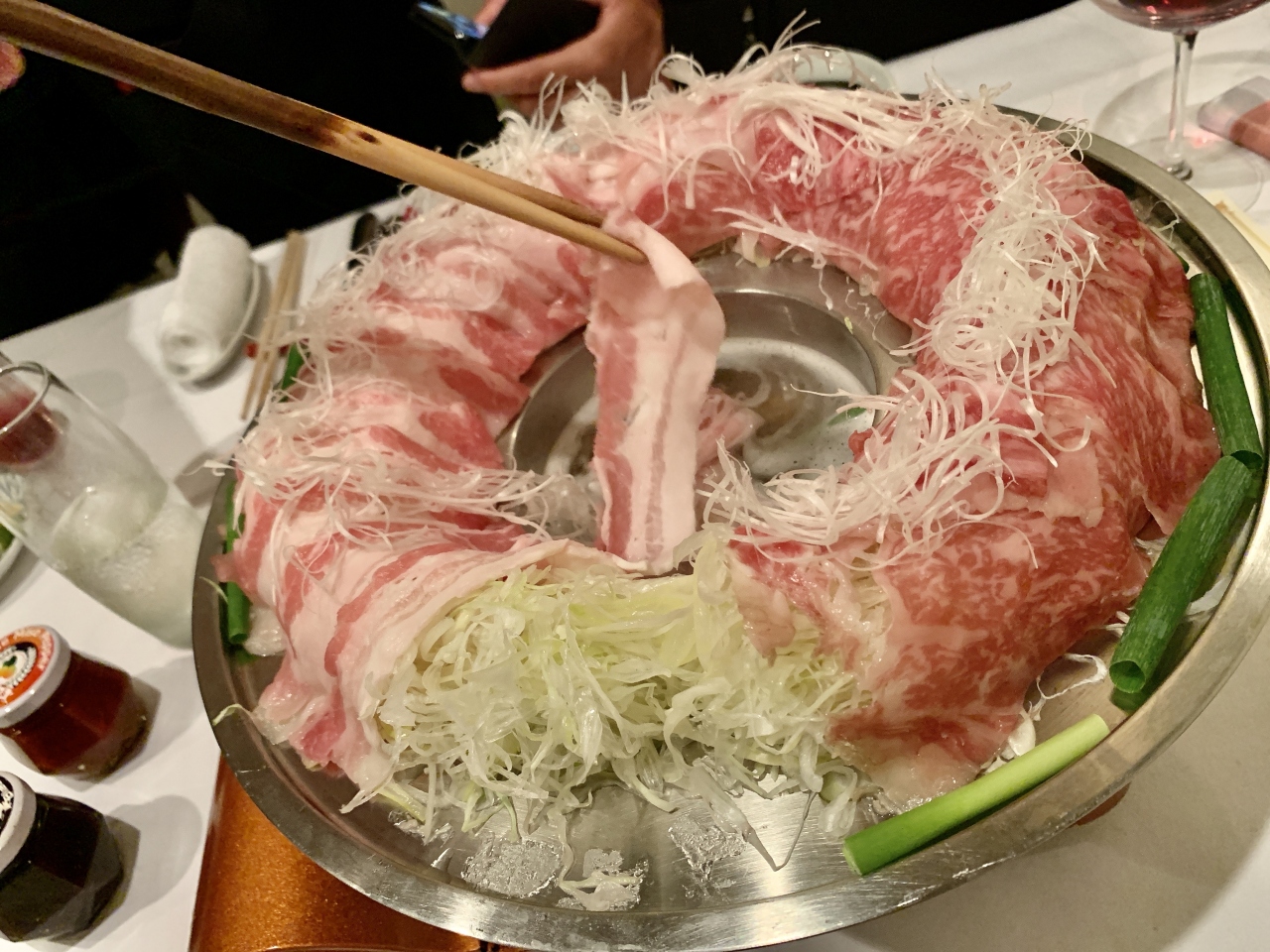 博多炊き肉鍋「特選黒毛和牛サーロイン&沖縄あぐー豚のMIX鍋」→卓上コンロにオリジナル特殊鍋が用意されます~窪んだ中心には2日間かけて仕込んだ牛テールスープが入り・・・その周りにドーナツ状に美しく盛られた「特選和牛&アグー豚」がモリモリと肉盛りされていますね~こりゃ映え!