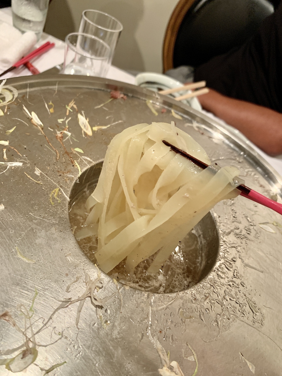 鍋の〆にはモチモチ食感の杵打ち平麺でスタッフが仕上げてくれます~ツルツルしこしこきしめん風で最後のテールスープは色んな具材の出汁が絡んで美味しかった。
