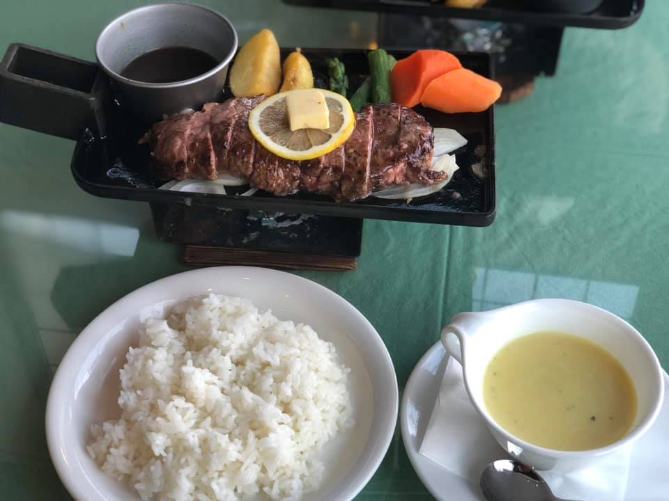牛ステーキ200gとセットのコーンスープと米とサラダ