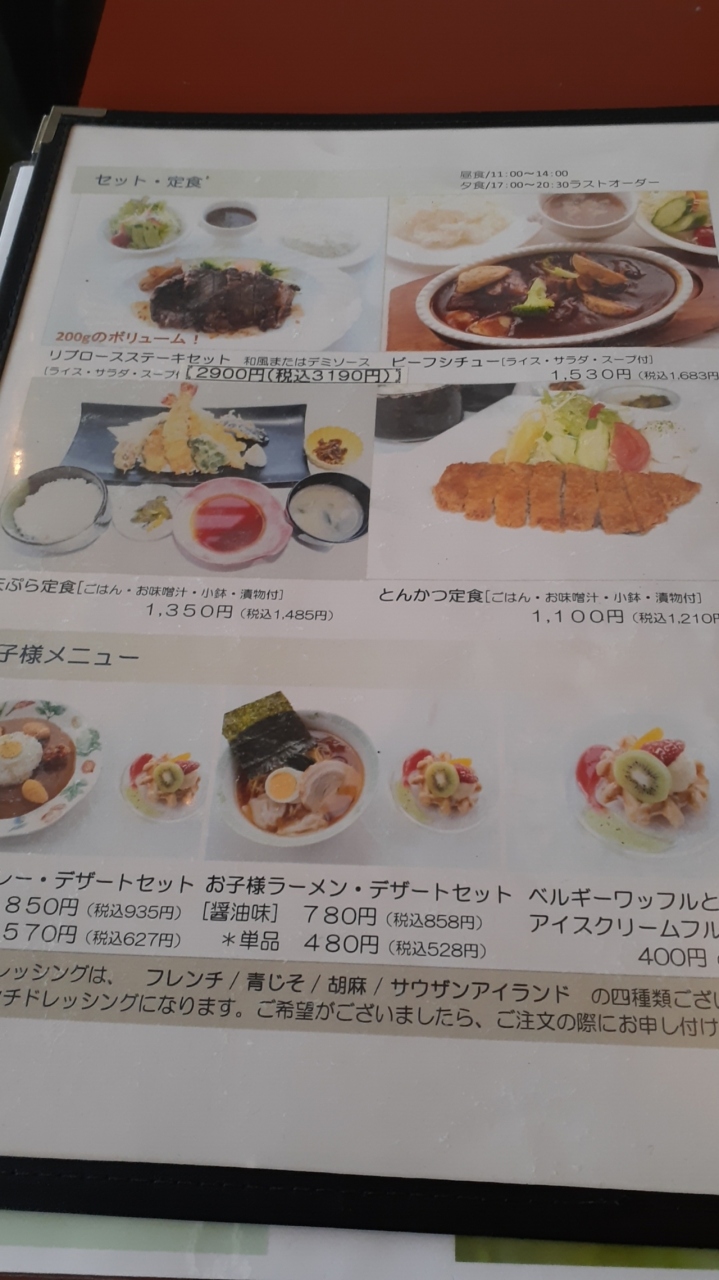 メニューですが、定食モノの他、丼モノ・カレー・ラーメン・そば・うどん等様々なジャンルの料理がありましたが、定食モノの場合、とんかつ定食・天ぷら定食・リブロースステーキセット・ビーフシチューセットの4種類程度しかなく、その点は不便さを感じるかもしれません。