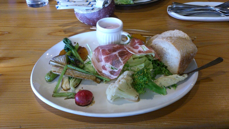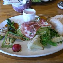 ワンプレートの生ハムサラダランチは、生野菜だけでなく数種類の焼き野菜とカスピ海ヨーグルトとパンと飲み物がついてます。