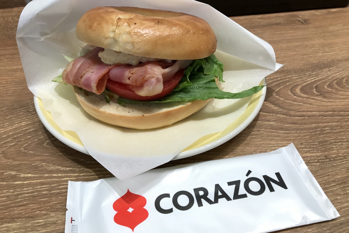 お店の売りは米粉を使ったパンケーキのようです。焼きあがるまで時間がかかるということで、今回はパス。『BLT with E ベーグルサンド』をいただきました。