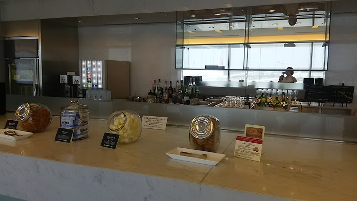 ・ラウンジエリア:かなり広々としており,バーカウンターもありました。下の階では,飲み物のほか,キルフェボンのクッキーやナビスコのクラッカーなども用意されています。