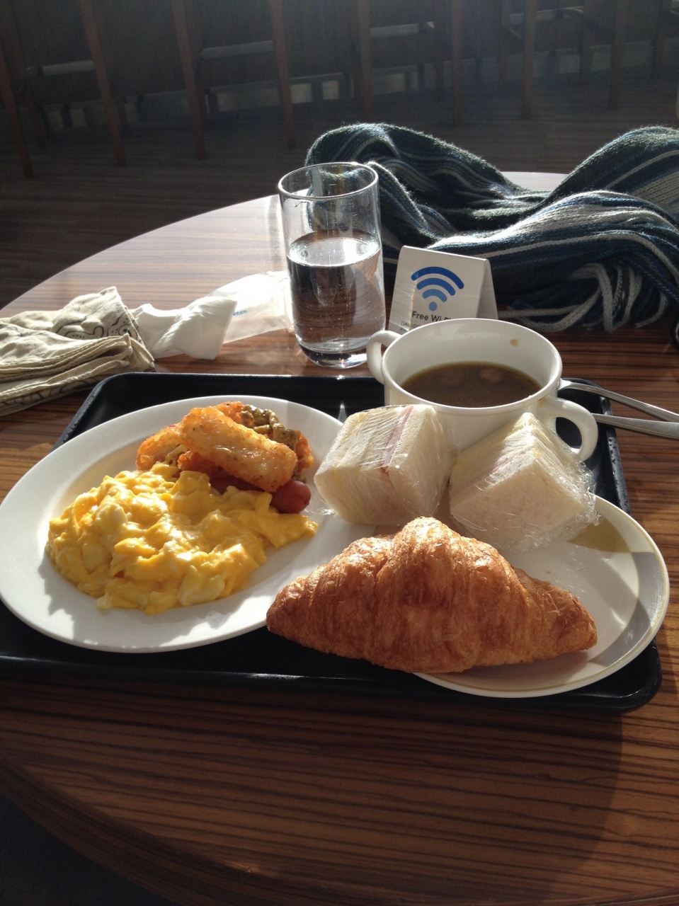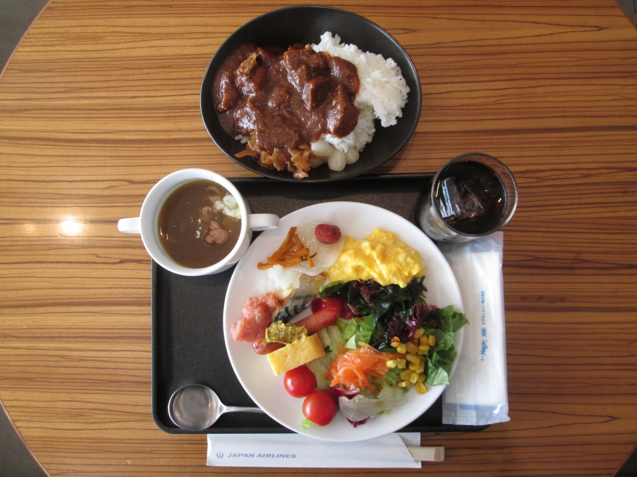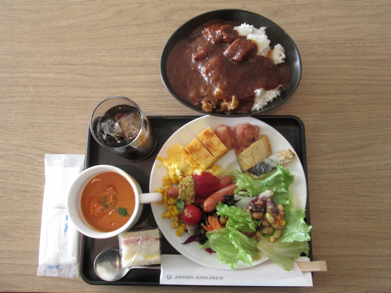 午前11:35の便で出発だったため早めにラウンジに行って食事の階に行ったらブッフェが朝食のメニューでサラダ、ソーセージ、スクランブルエッグなどでした。もしかしたら和食もあったかもしれないです。午前10時までが朝食メニューです。10時からはランチメニューでカレーが美味しかったです。下の階はワインなどのアルコール類やコーヒー、紅茶などのソフトドリンクに柿の種やクラッカー、チーズなどの簡単なおつまみがあって食事と階が分かれています。