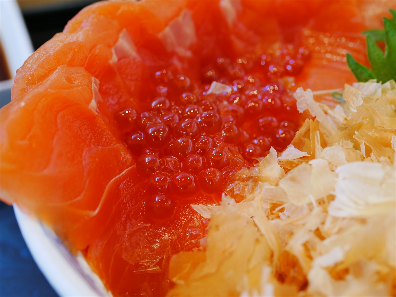 【鮭鮭丼】サーモン7切れ。イクラは大スプーン2杯程度。鰹節だけむせ返るほど大量。注文すると呼び出しベルを渡される。けど、確... 続きを読む保しといた席に戻りきる前にベルが鳴るからビックリ。ドキッとして心臓に悪い。オーダーしてから一分以内の出来上がり。そんなに早く出来るならカウンター前で立って待ってた方がよっぽど楽だわ。サーモンは注文を受けてから柵を切ったんじゃなくて、切り置き済みで乾燥したのを盛った感じ(笑)