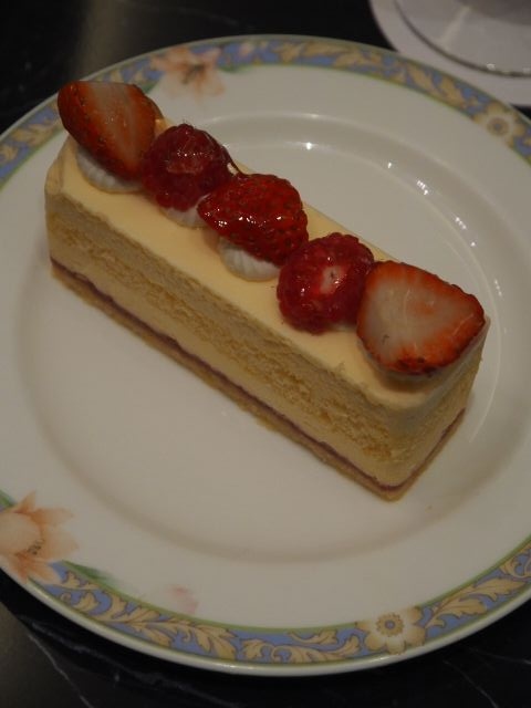 イチゴ風味のチーズムース、スポンジケーキ、そして更にイチゴ風味のチーズムースを重ね、苺をトッピング。。