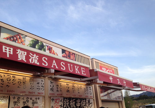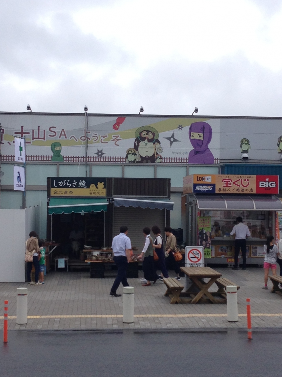 このSAは、上りと下りが兼用なので、高速から入る場合はどっち側の駐車場に停めたか(上りと下りどっちを走ってるか)を忘れると永遠に迷うことになるかも。 入口の忍者たぬき像の色でも区別できますね。