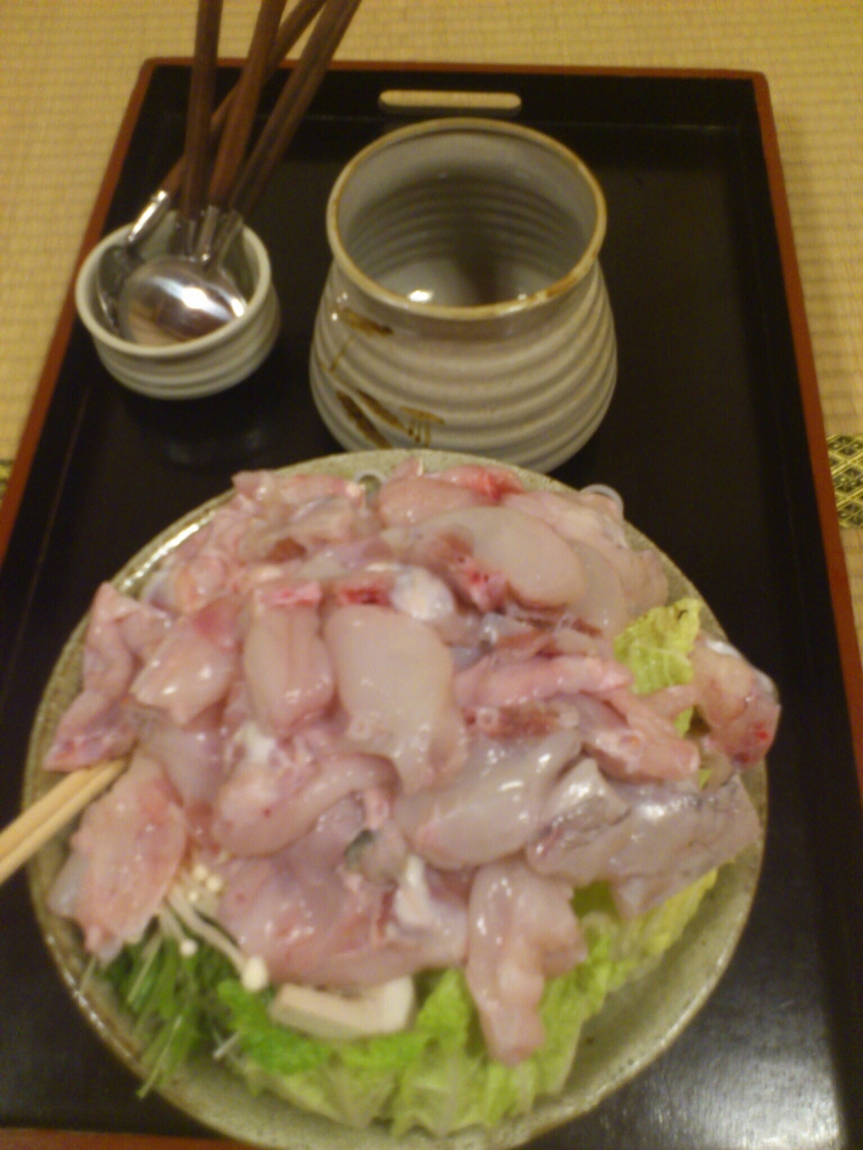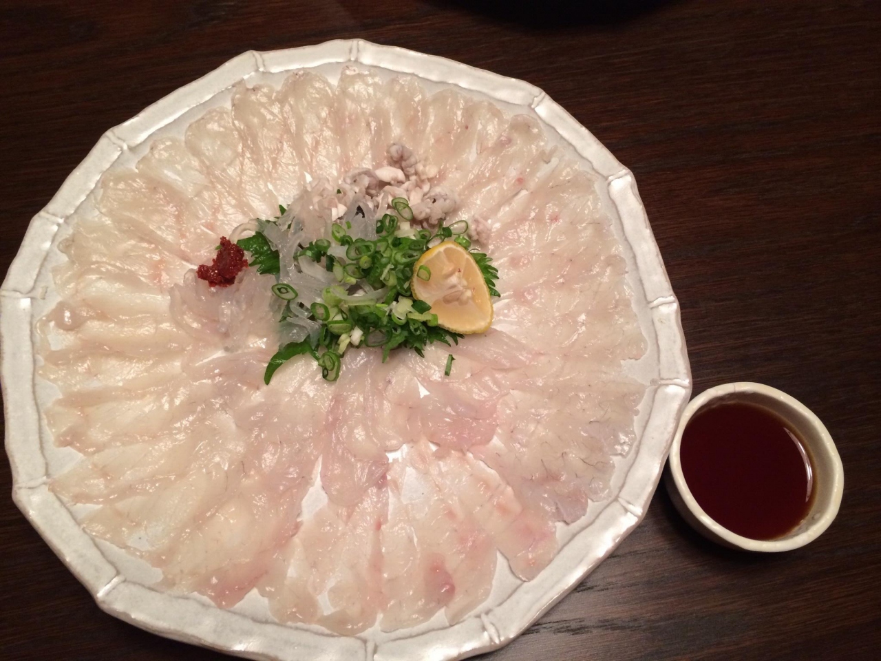 まず、八寸や突き出しが出てきて、その後に「てっさ」です。この「てっさ」の大きさに驚きます。自分の顔より大きなお皿に、ぐるりと一周ふぐが乗っています。こんな贅沢なのは初めてです。