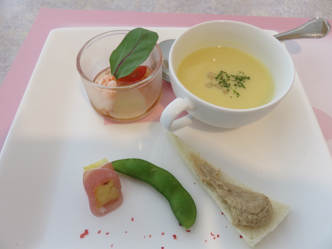 コンパクトにまとまったオードブルに、タピオカがトッピングされたスープ