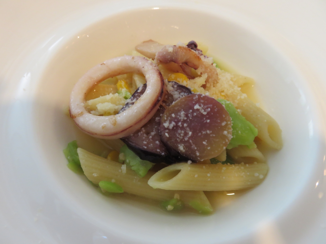 次に、イカと空豆のペンネ 茄子のマリネ添え