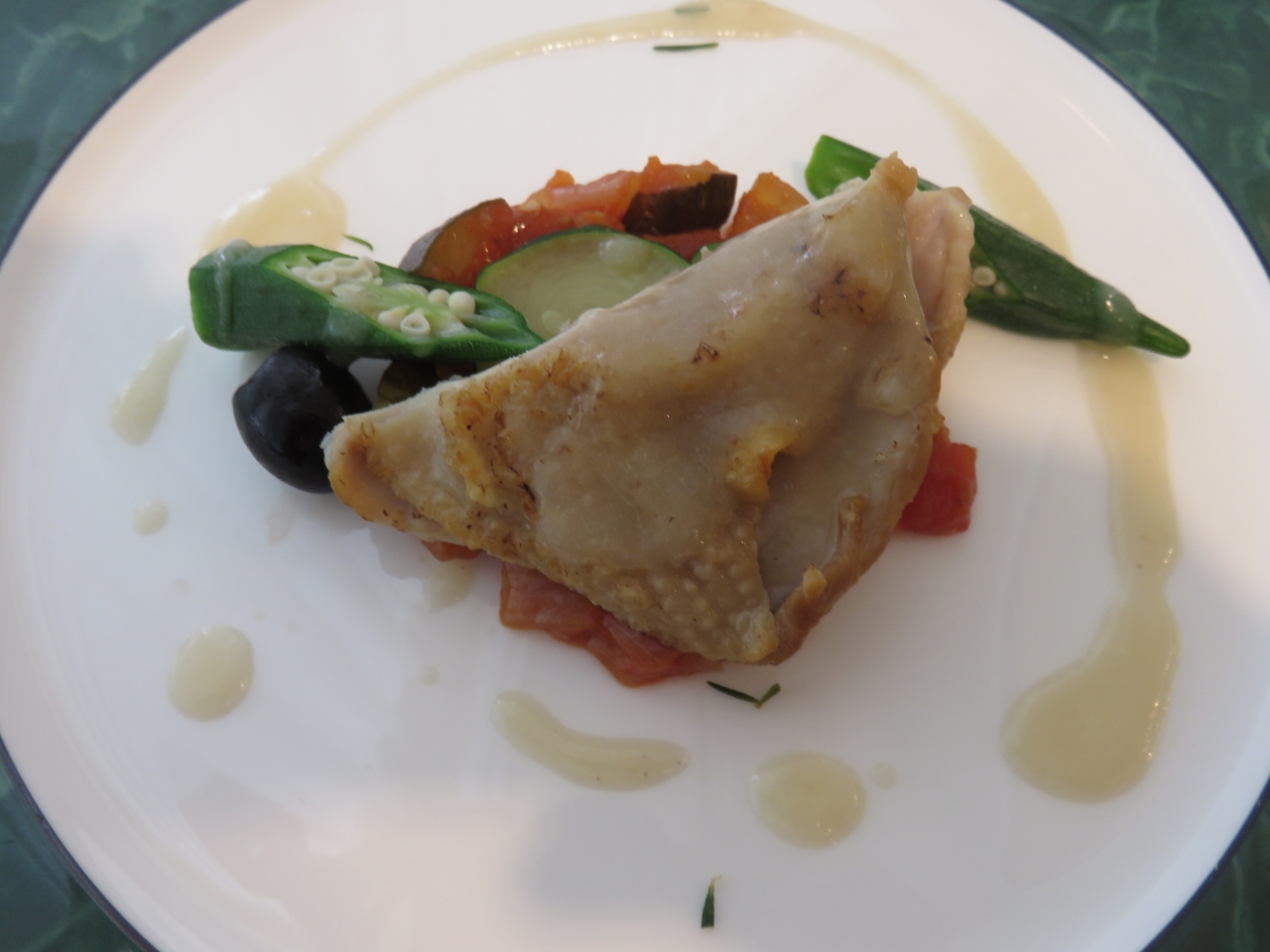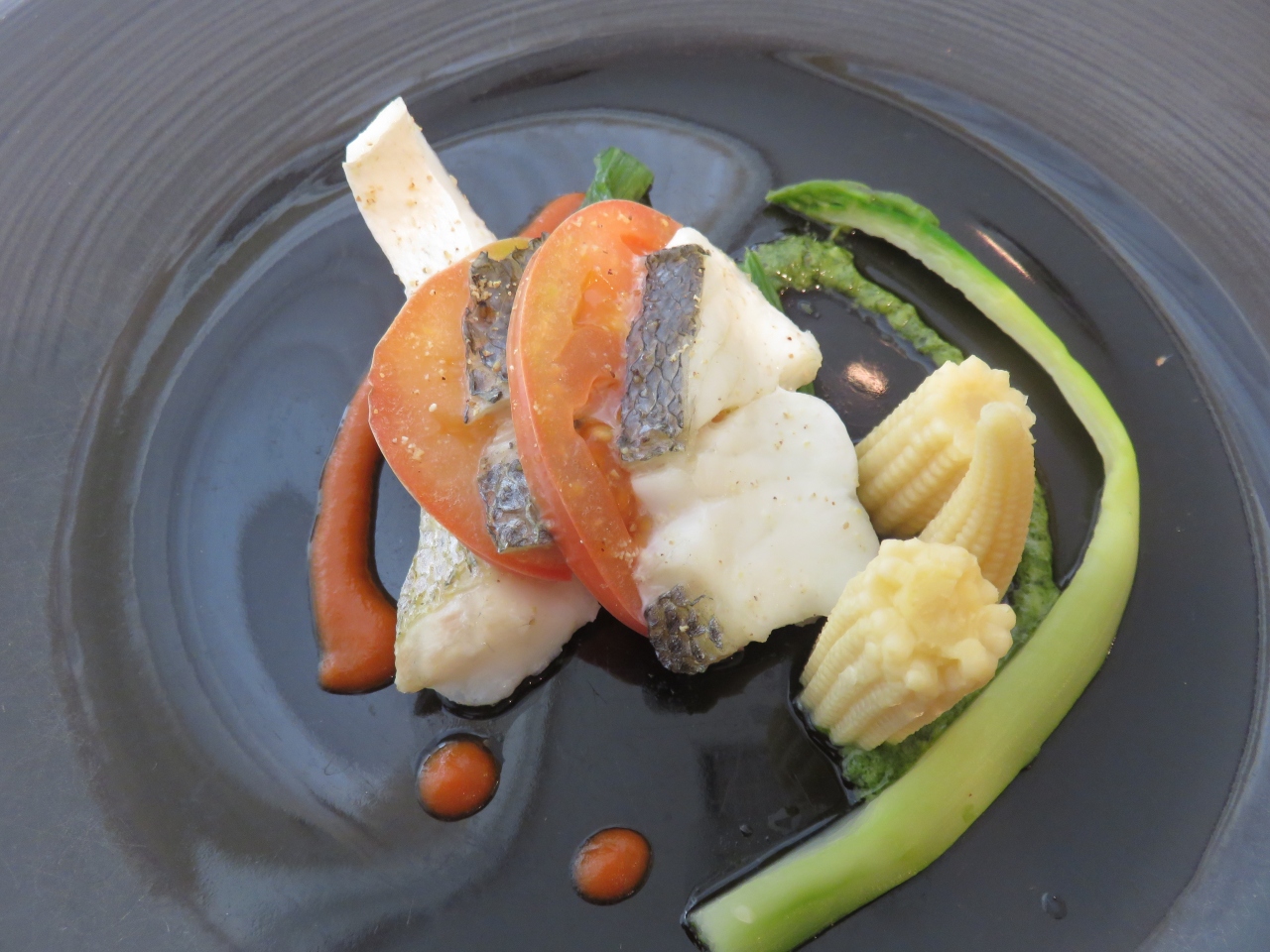 メインは、魚介料理がスズキとトマトの重ね焼き バジルとトマトソース&肉料理がチキンとオリーブのブレゼ ローズマリーの香り