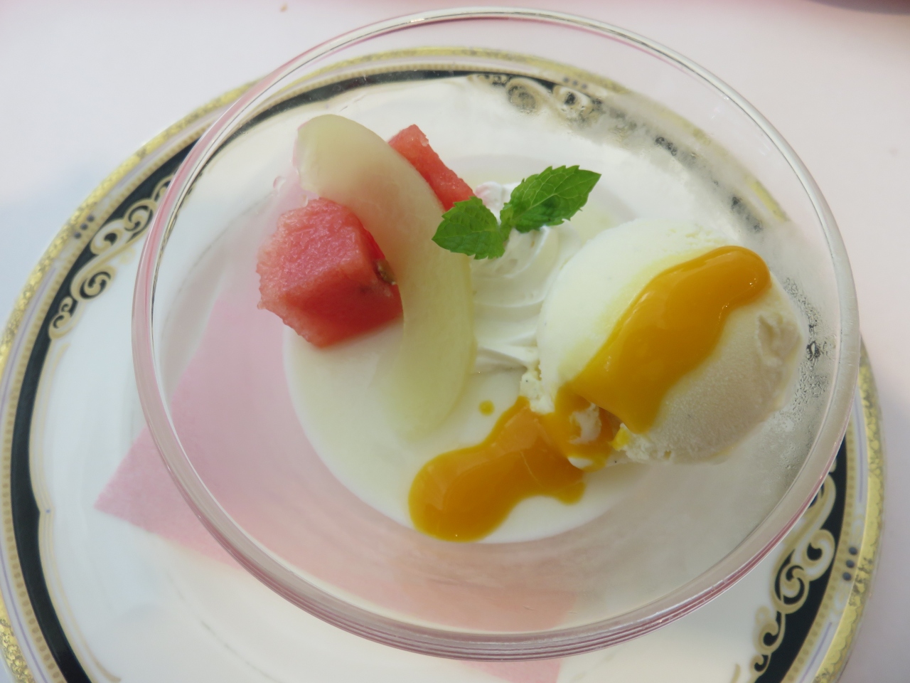 甘さ控えめでボリュームあり、スイカもちょこんとトッピング
