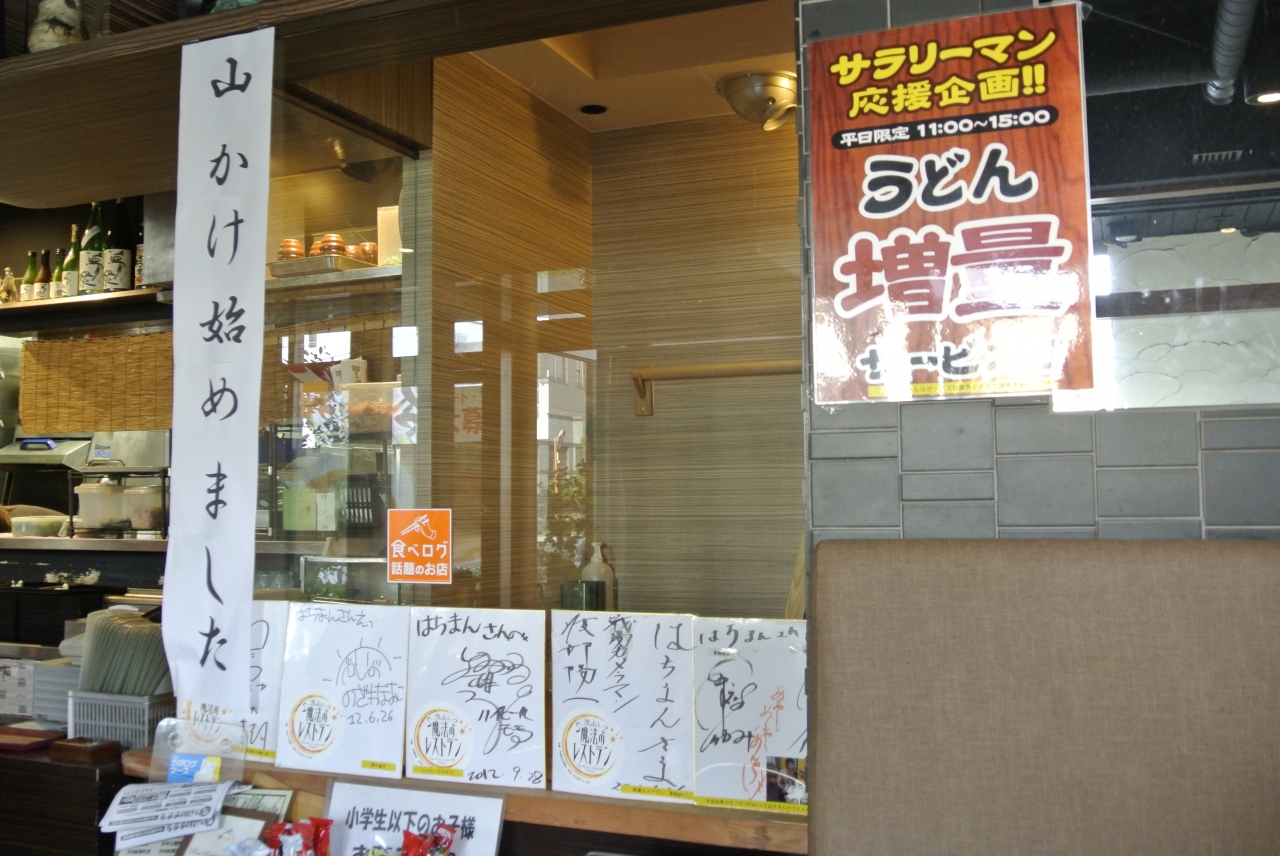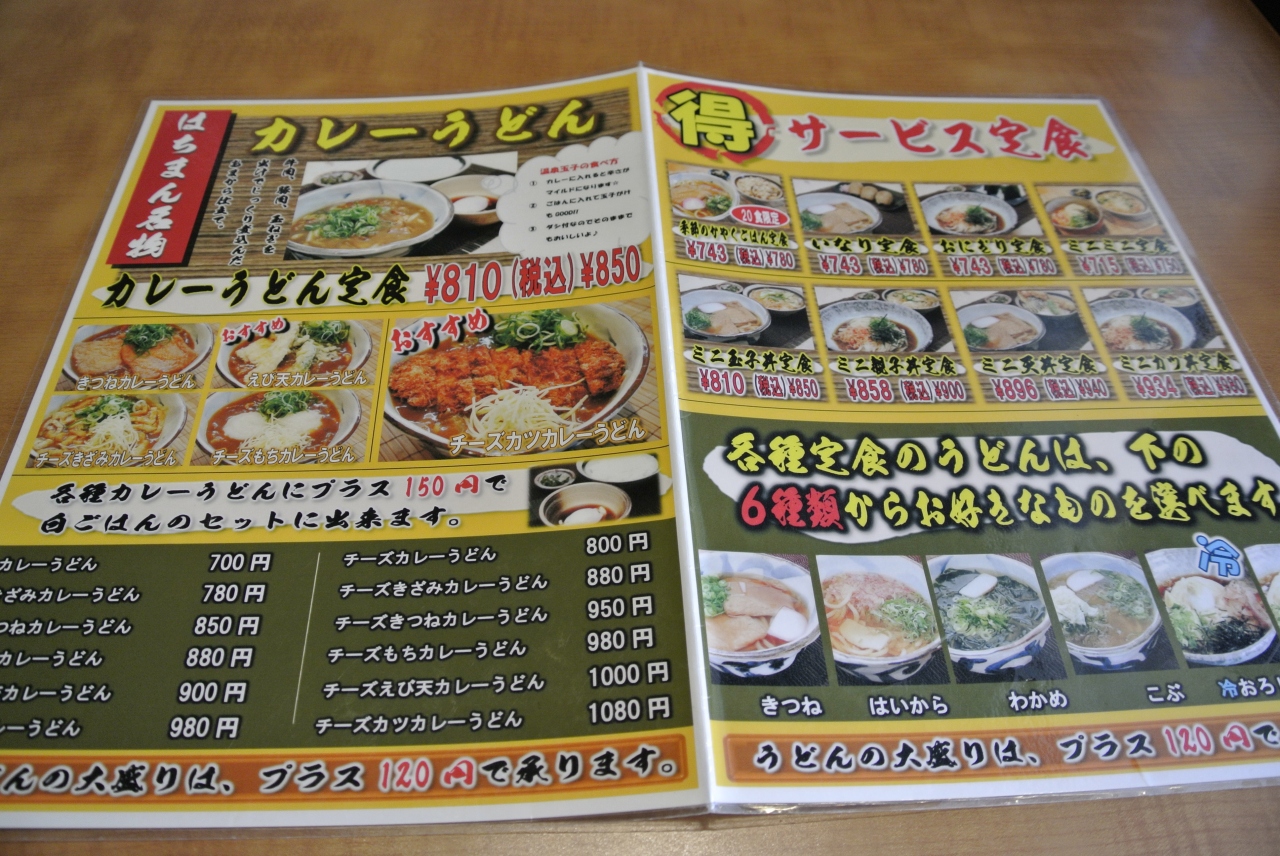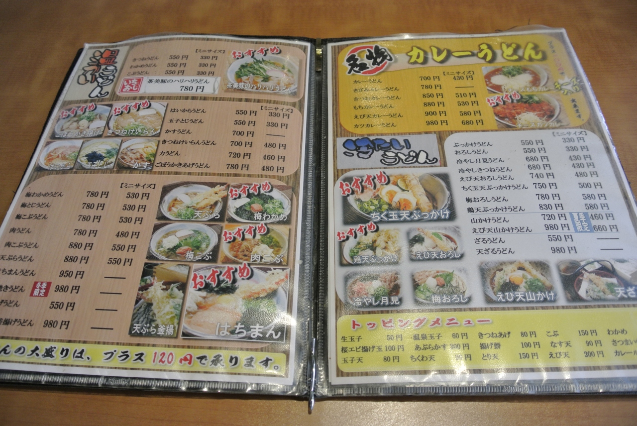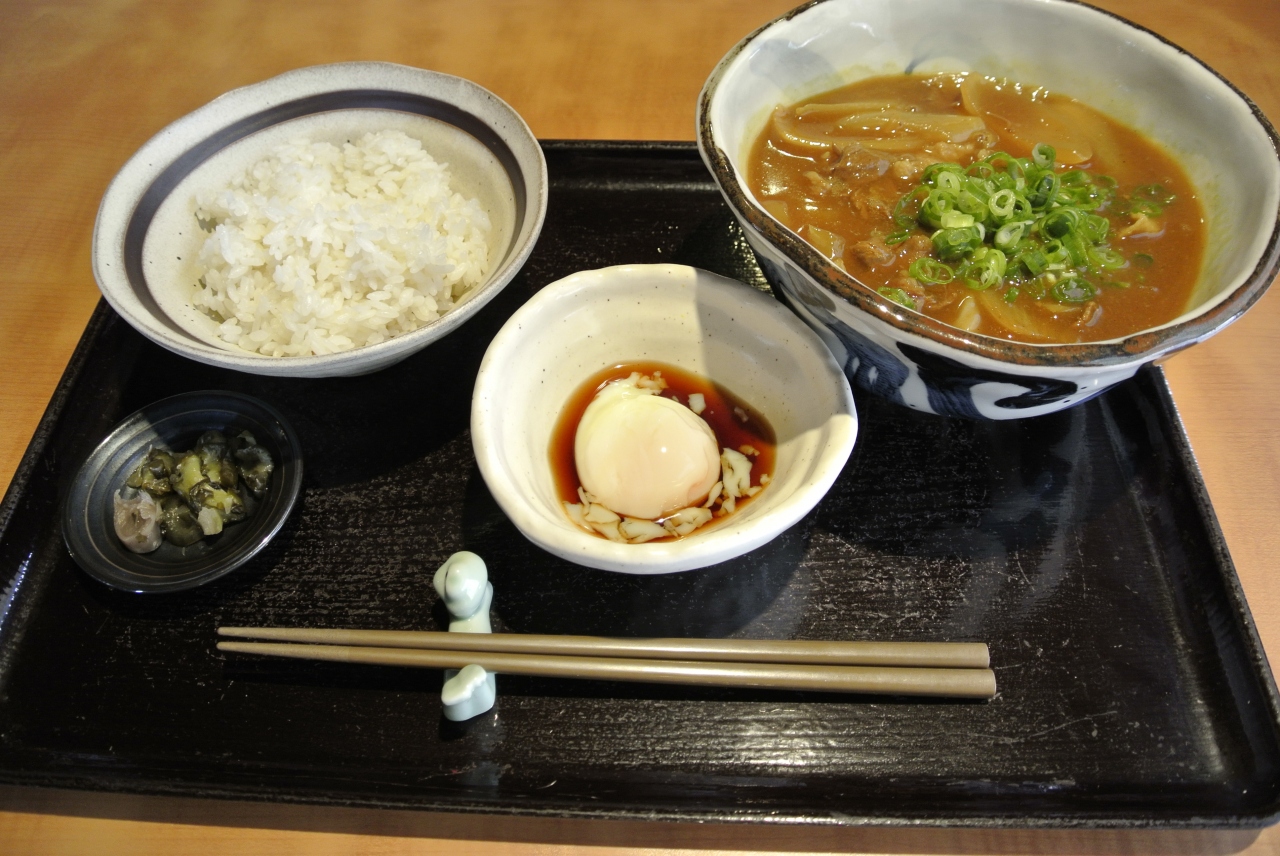 祝日の午後3時半はさすがに客がおらず、がらがらでした。カレーうどん定食と、肉うどんを注文しました。カレーうどんは単品で700円、各種カレーうどんにプラス150円でご飯が付けられるのですが、カレーうどん定食は850円、つまりカレーうどんプラス150円でご飯のほかに温泉玉子が付くのでお得です。カレーうどんにはチーズや、餅や揚げ、海老天やトンカツなど、色々なトッピングが可能です。
