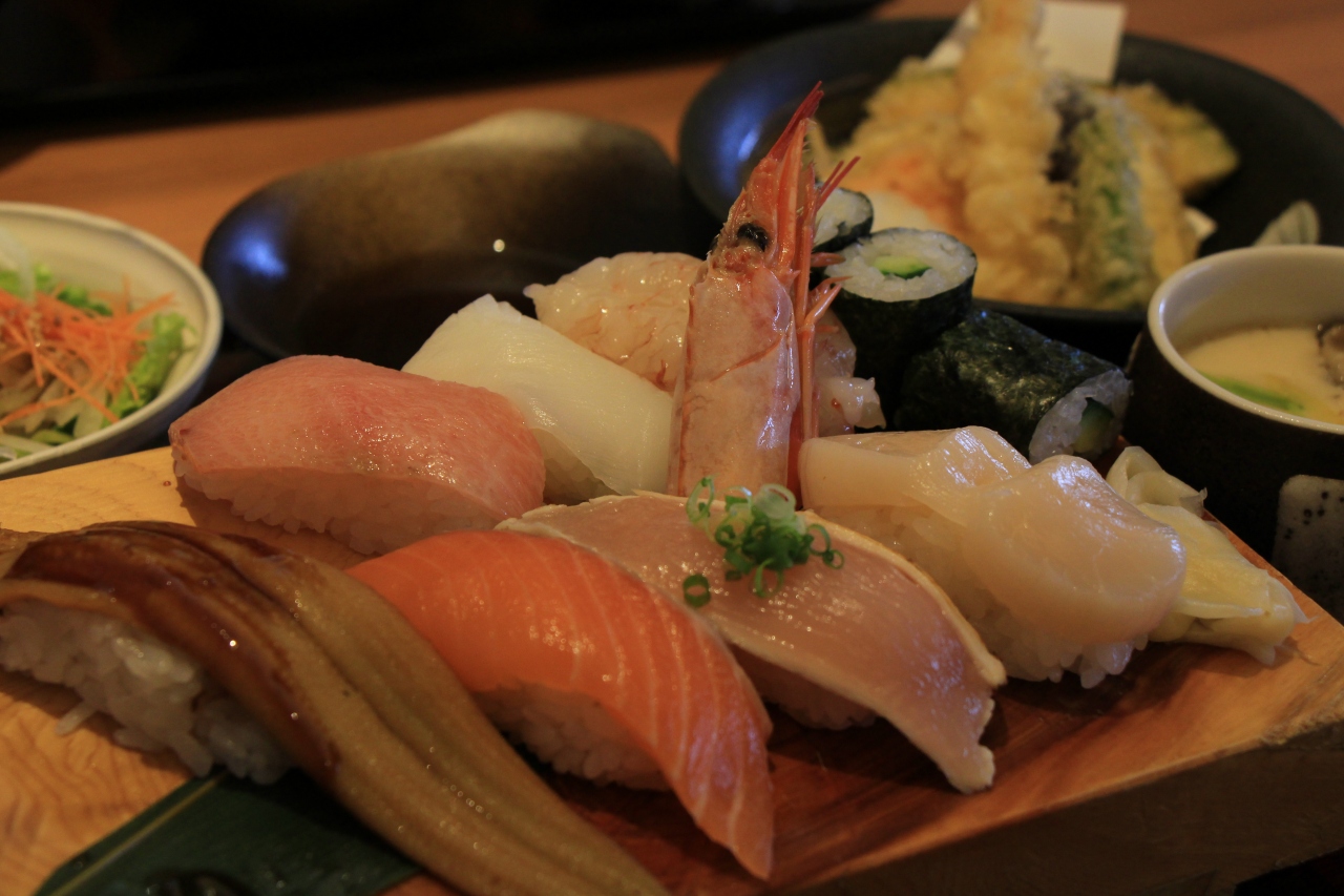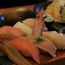 人気の冬ランチはお寿司8貫と天ぷら、大根の煮物、茶碗蒸しの付いたセットに