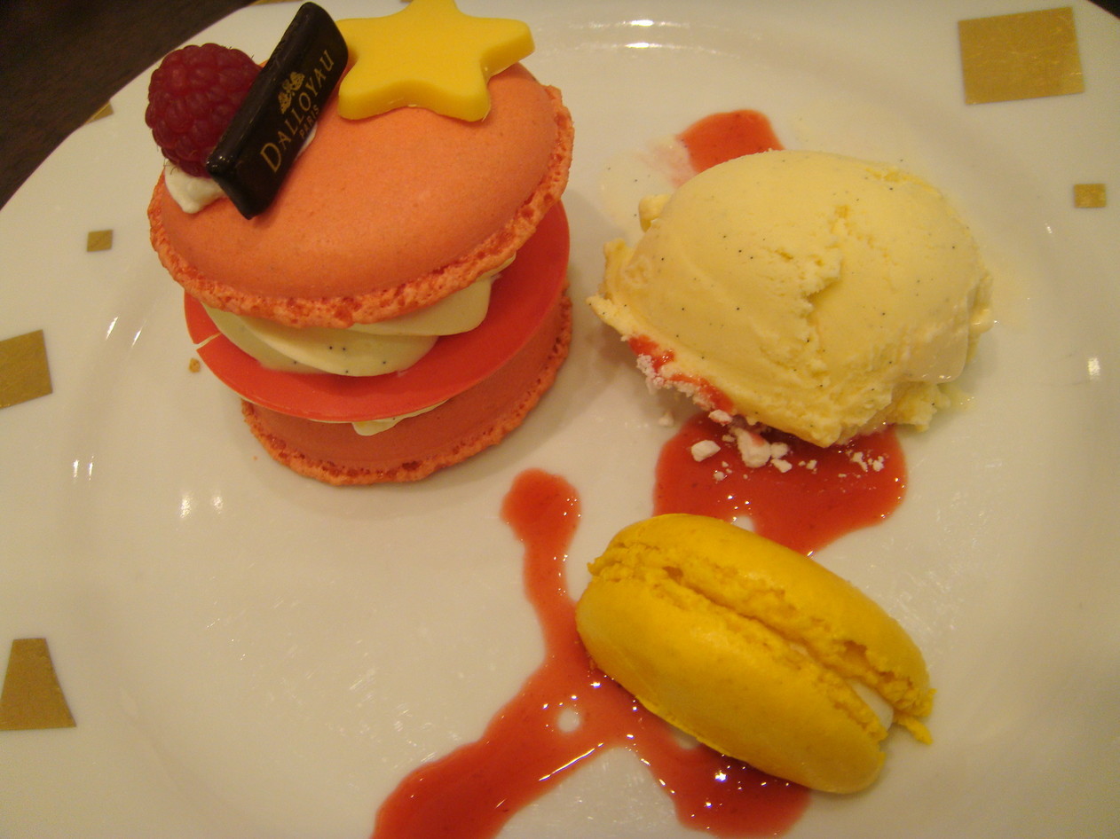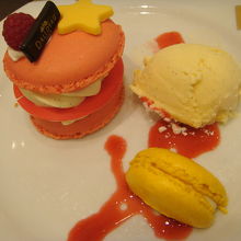ケーキにはマカロンとアイスクリームがトッピングされていました。