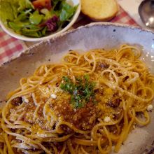 スパゲッティに、平打ち麺のリングイネを混ぜてあり、ソースとよく絡む上、食感にもバライエティをもたらしている。茹で加減はアルデンテより若干柔らかい感じだが、リングイネを混ぜ込んであるので、寧ろ丁度良い。客の中にはこれしか頼まないのもいるそうだが、それも納得出来る。