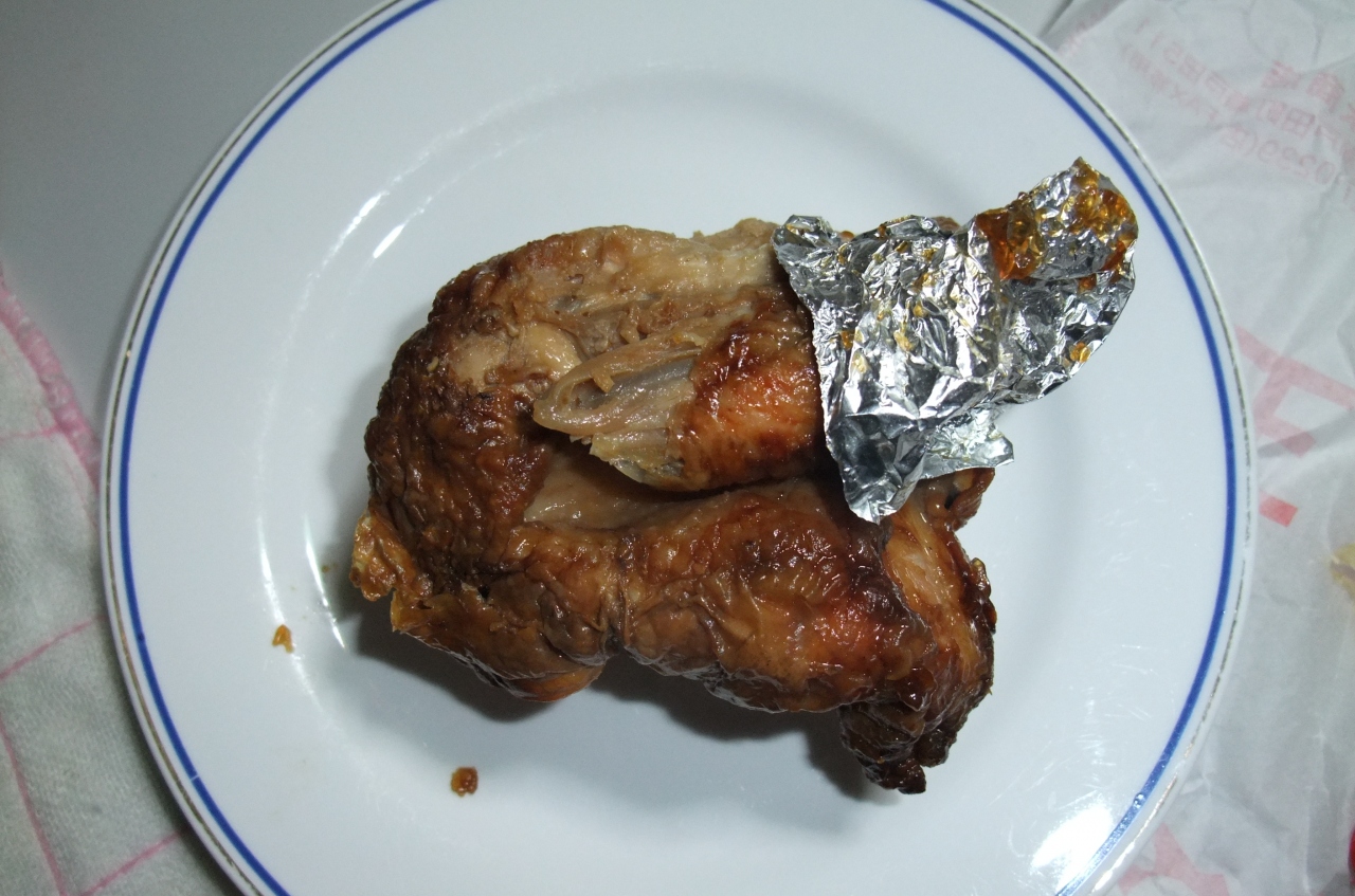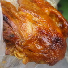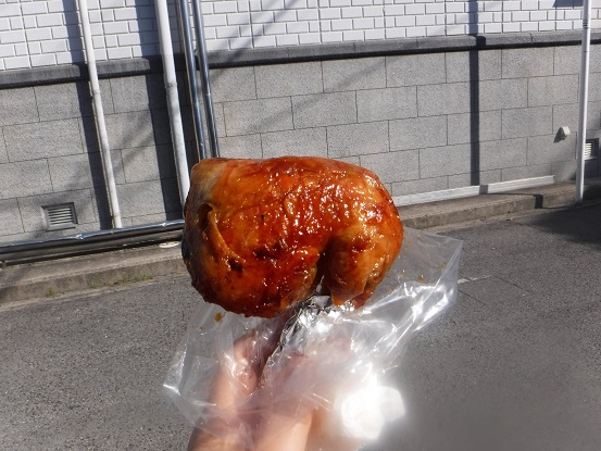 土曜日の午後1時は回ってましたが、まだ残ってました。早速ももを一本、値段は390円、ビニール袋に入れて渡してくれます。店の入口にベンチらしきものもあったような気がしますが、近くの何とかという墓碑の台座の縁に腰かけて食べました。皆さん店頭や路上で立ち食いのようです。