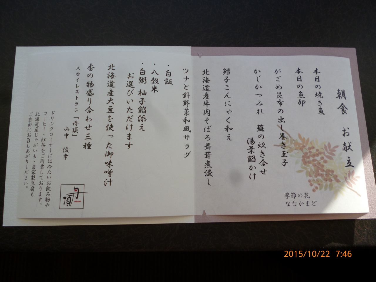 最近、メニューが少ないような気がして、利用していなかったのですが、久しぶりにHPで見てみると道産食材を用いて4種類ほどのセ... 続きを読むットメニューができていたので敬老の日のお祝いで利用しました。メニューの内容的には肉料理が入ることで値段が上がるような感じで、肉料理が苦手な私たちには一番安いものがかえって気に入った内容でした。そこに季節限定の松茸の握りを加えて、デザートも含めて満足できました。また、利用したいです。ところで、お店からの景色ですが、35階という高層階に位置しますが、東側の景色が見えるので丘珠空港に発着する飛行機が見えますが、残念ながら大通公園やすすきのなどの札幌市中心部の夜景を楽しむことはできません。 閉じる