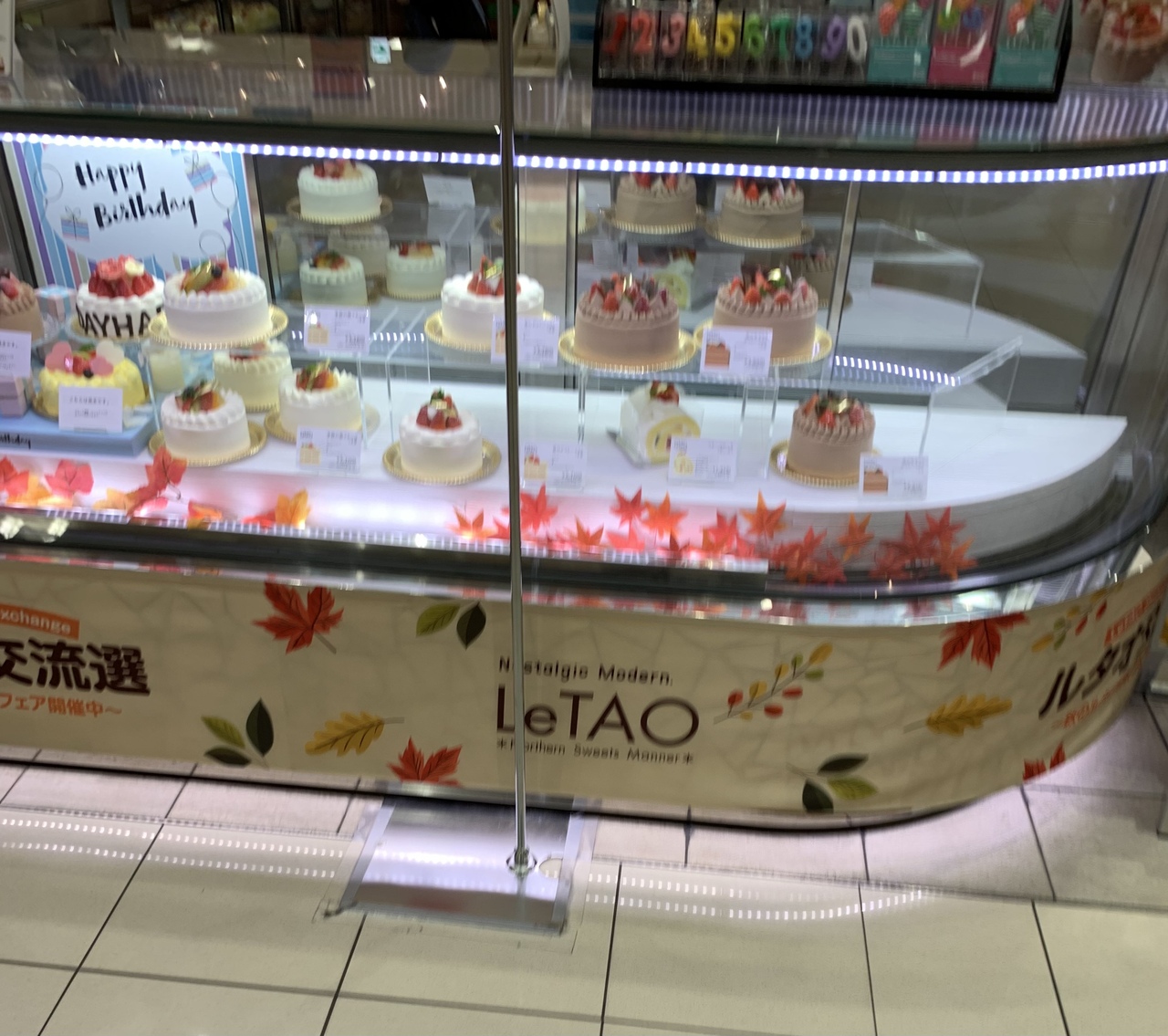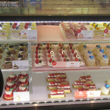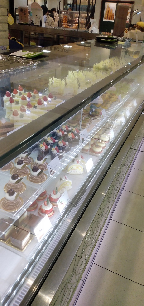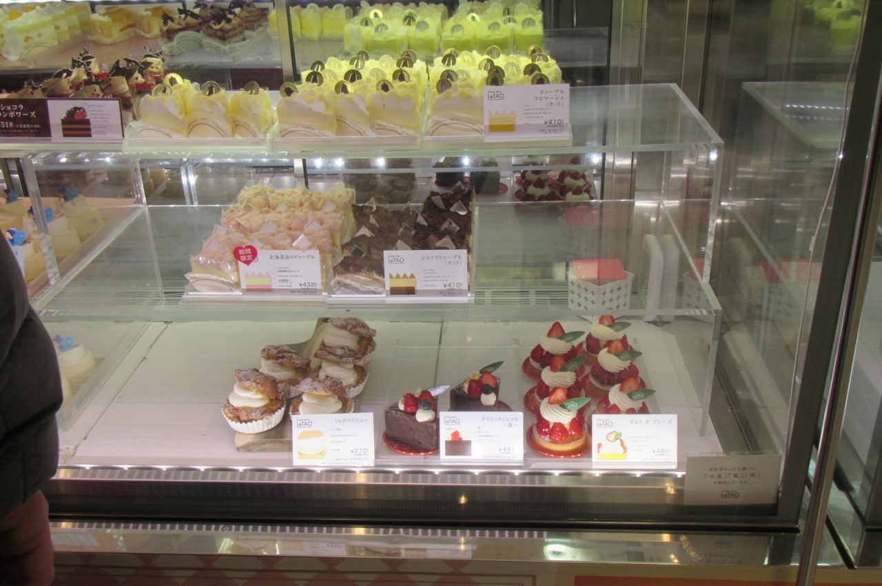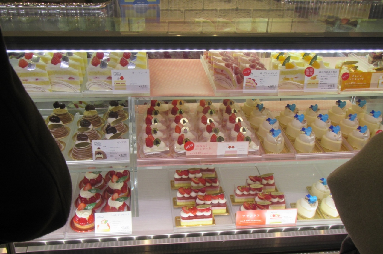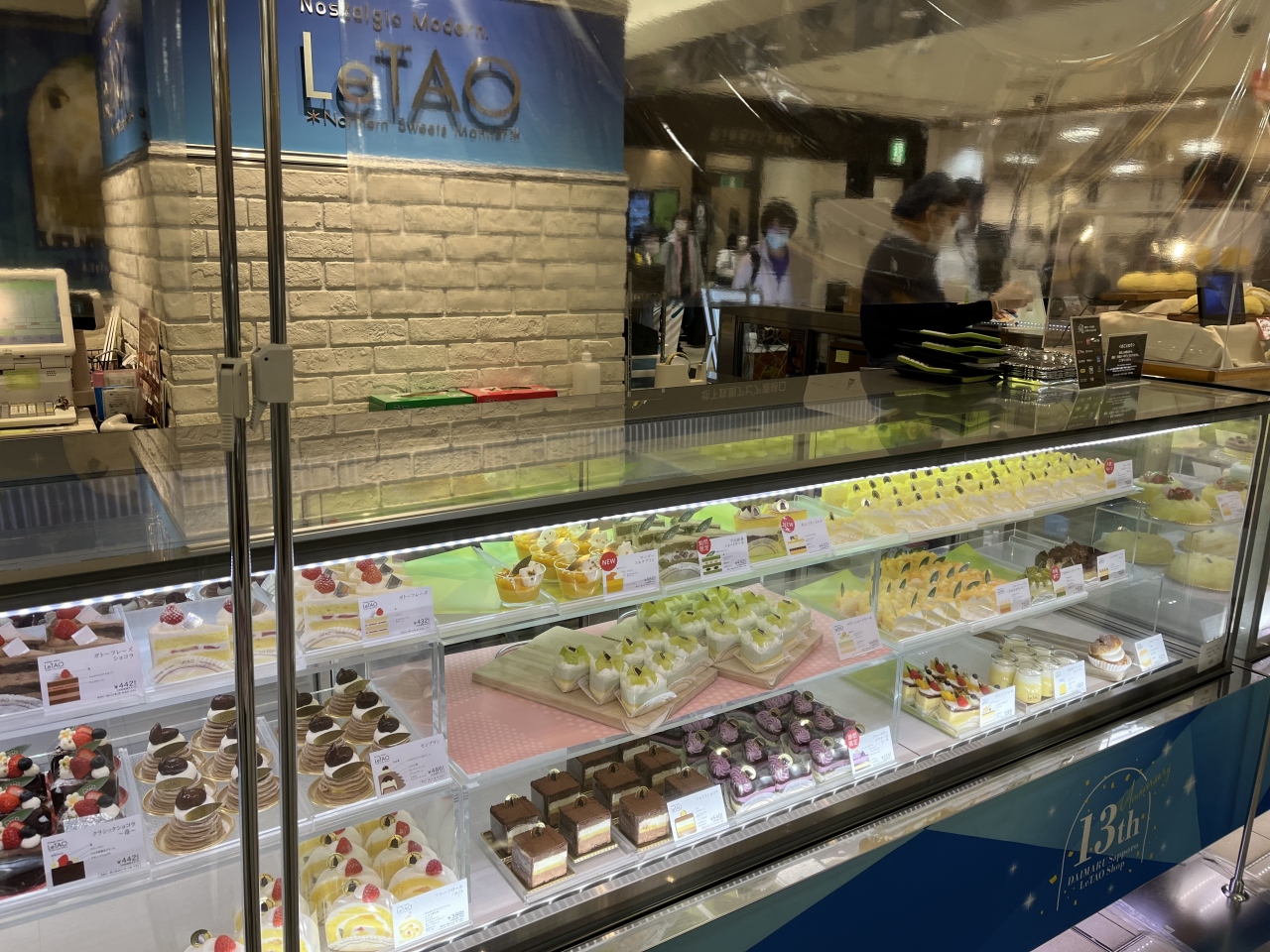 大丸の入口でショーケースの中に美味しそうなケーキ
