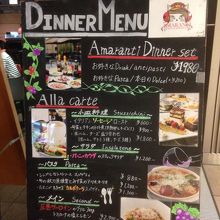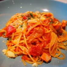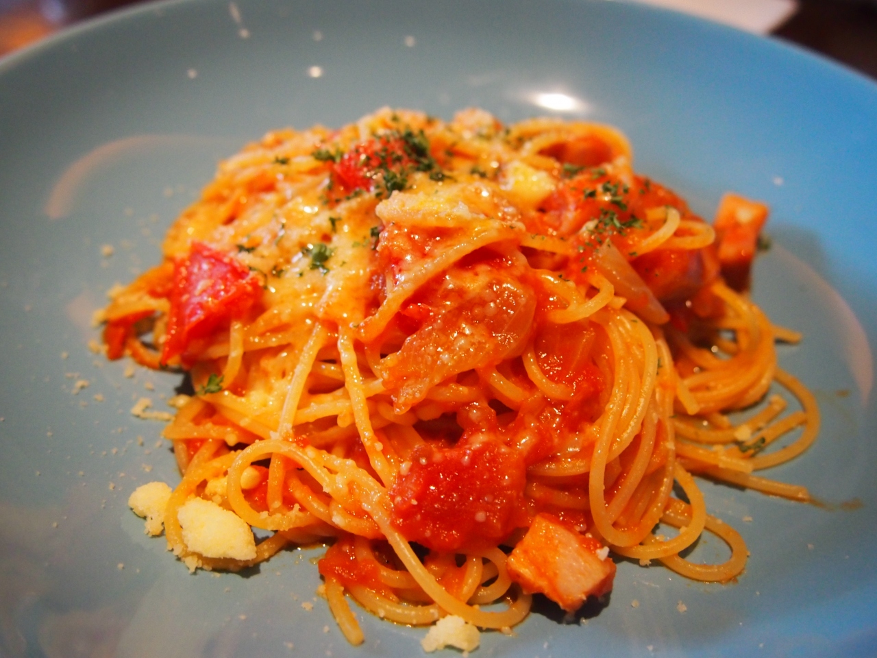 ランチの種類が何種類かあります。パスタやハンバーグがあり迷いましたが厚切りベーコンとキノコのトマトスパに決定。前菜、ドルチェをセットにして1680円でした。