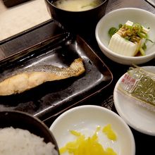 焼鮭、冷奴、漬物、海苔、味噌汁から成る。