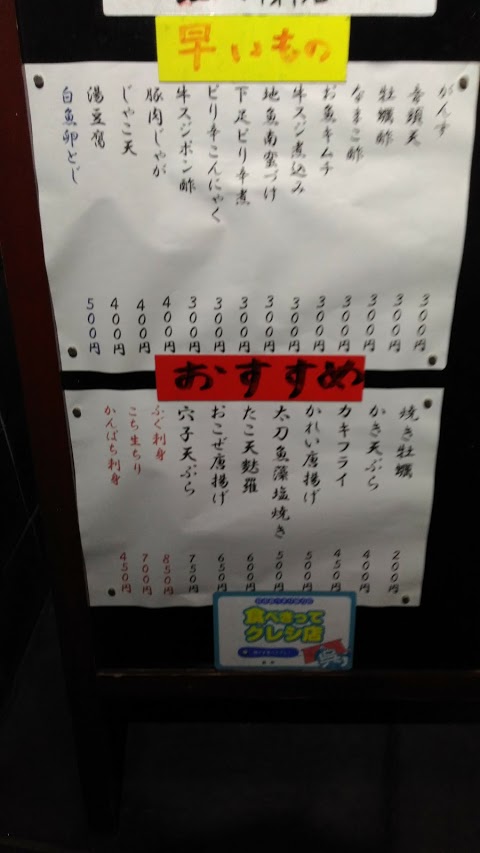 晩酌セット1500円をいただく。つきだし、刺身盛り合わせと焼きあなごがついて、地酒一杯と充実した内容。アナゴは2匹ついてなかなか良い。地酒をもう一杯頼み、本日のお薦めにあるのがメバル、おこぜ、太刀魚、カキなど、オコゼでも1000円しないのでお手軽値段でよい。どれも食べたいと目移りするが、とりあえず定番のカキフライ。揚げたてでおいしくいただきました。