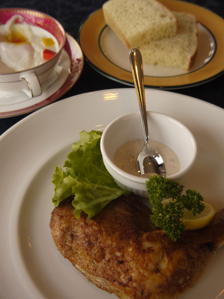 骨付き鶏のコンフィは、正式には「ラ・コンフィ・ドゥ・ヴィライユ~骨付き鶏のコンフィ セピア色のフレンチ仕立て」と長たらしい料理名。骨付きのチキンレッグを、低温の油でじっくりと火を通し、表面を焼き上げている。フォークで軽く付くだけで肉が骨からこそぎ落とせる程柔らかく仕上がっている。ソース(2種類から選べる)を付けながらいただくが、ソース抜きでも充分味が付いている。 閉じる投稿日:2017/01/27