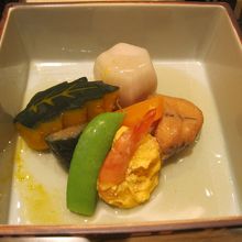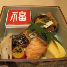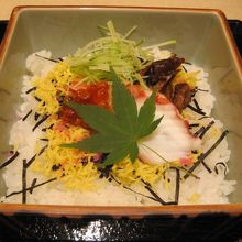 さて、陶器に入った三段弁当を広げてみると、ちらし寿司、煮物、焼き物が綺麗に盛り付けられていました。