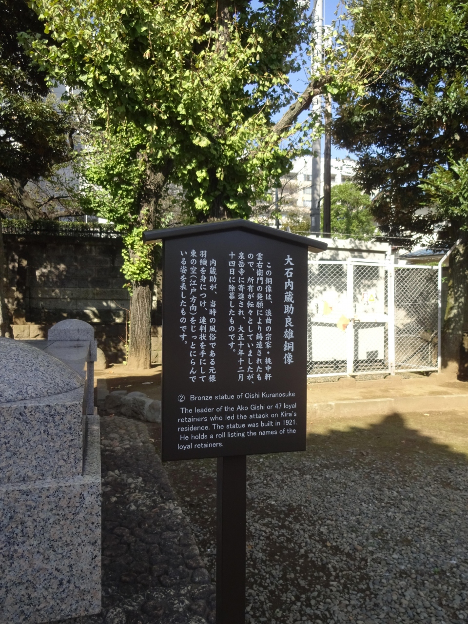赤穂義士が討ち入った吉良邸の一部が、現在の両国にある本所松坂町公園内に残っています。公園には首洗い井戸や、赤穂義士についての説明板などがあります。討ち入った後、吉良の首を主君の墓に供えるため、泉岳寺へ向かったため、泉岳寺に向かう道中には、忠臣蔵にまつわる石碑などが複数あります。