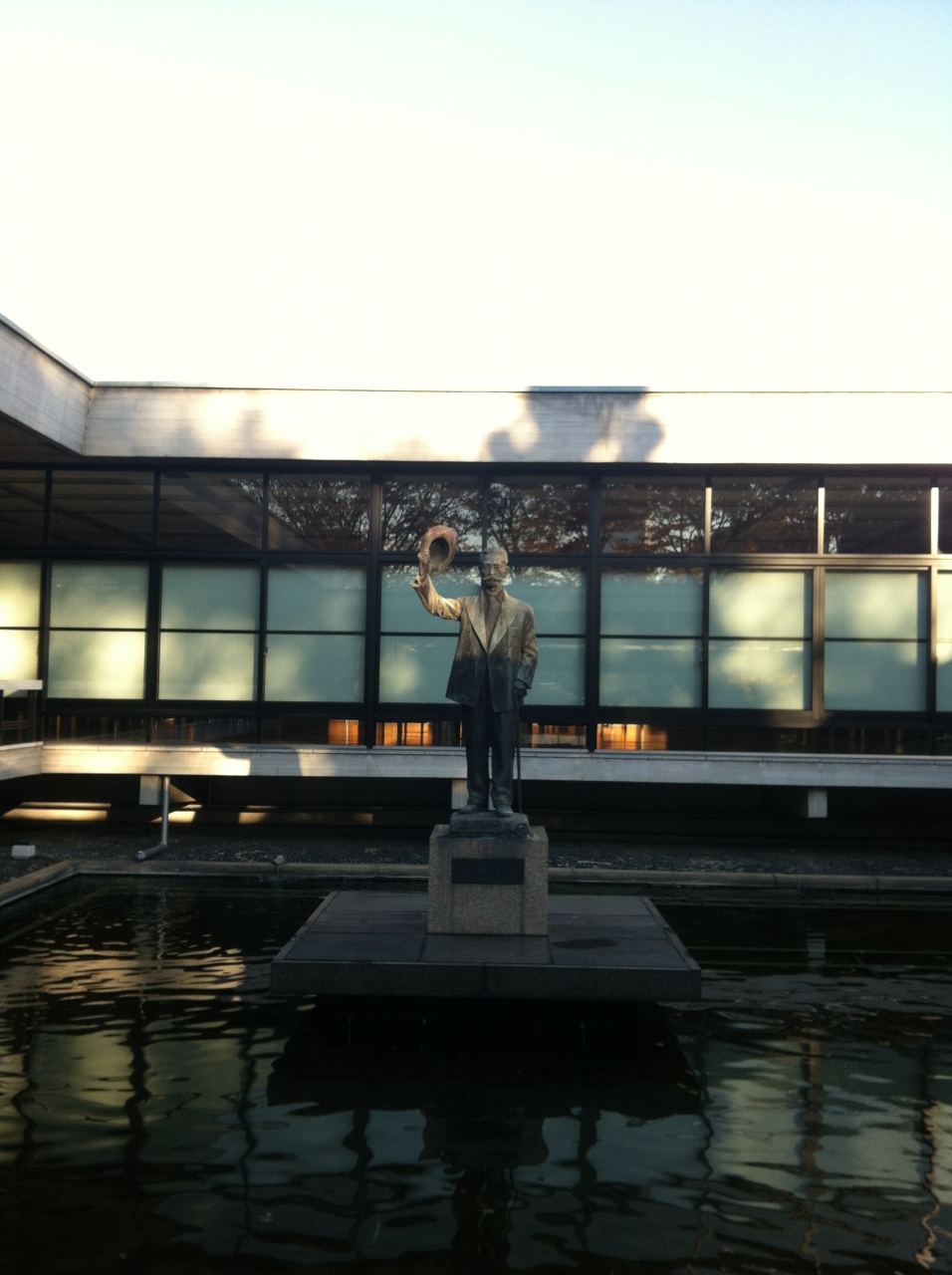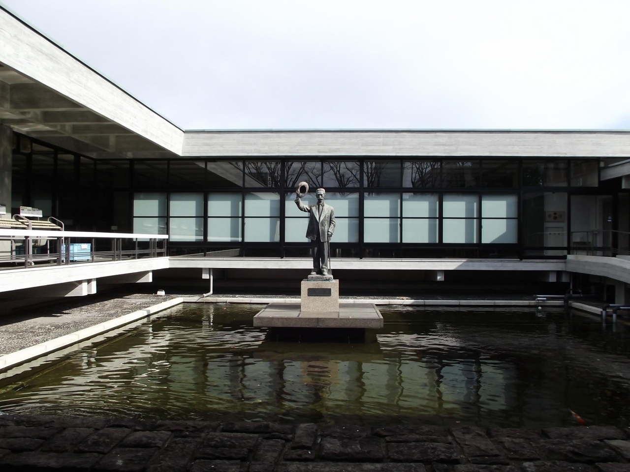 ここは、衆議院議員として当選25回60年7ヶ月在任し、1960 (昭和35) 年に衆議院から憲政功労者として表彰された尾崎行雄を記念して建設された建物を吸収して完成したものなので、入口正面にある池の中には尾崎行雄の銅像が建ててあり、入館者を迎えています。
