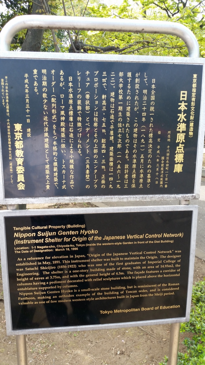 国会議事堂前にある国会前庭庭園には日本水準原点が置かれ日本の標高を測定する基準の場所で建物は国の重要文化財に指定されている... 続きを読む歴史ある建物です。現在の高さの基準は2011年3月11日の東日本大震災によって24mm沈下して基準の高さは24.3900mに改定されてます。 閉じる