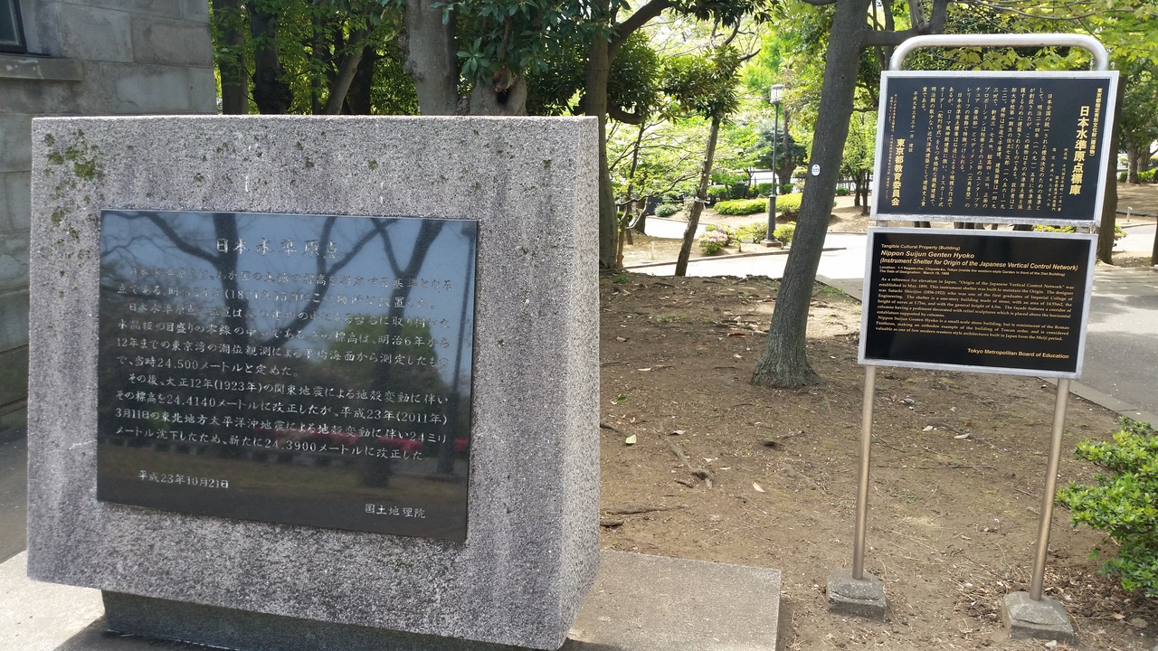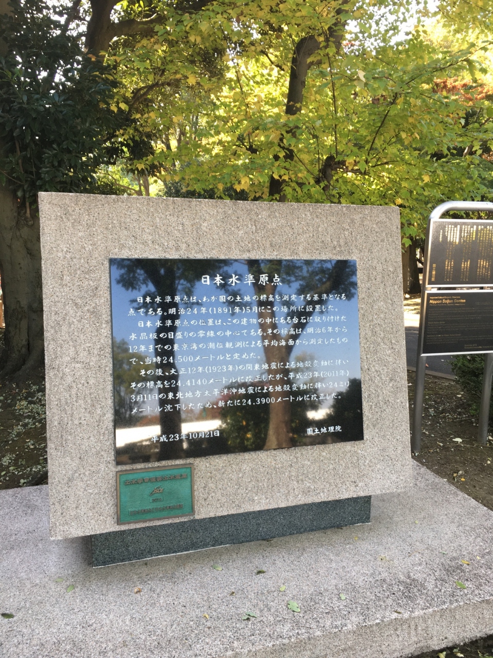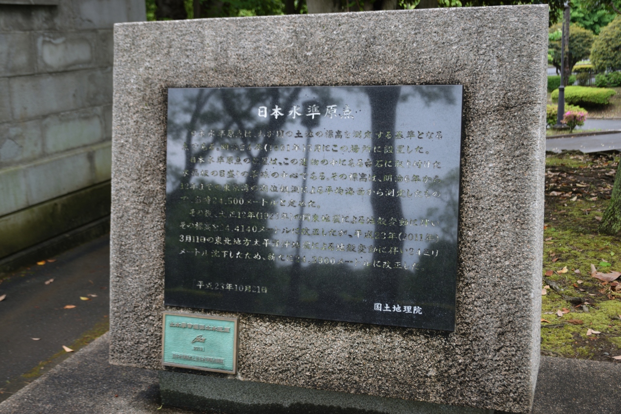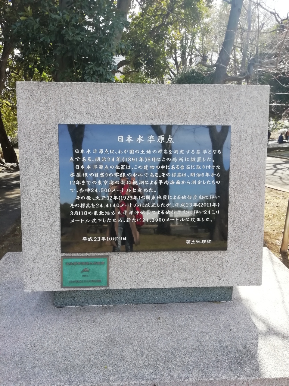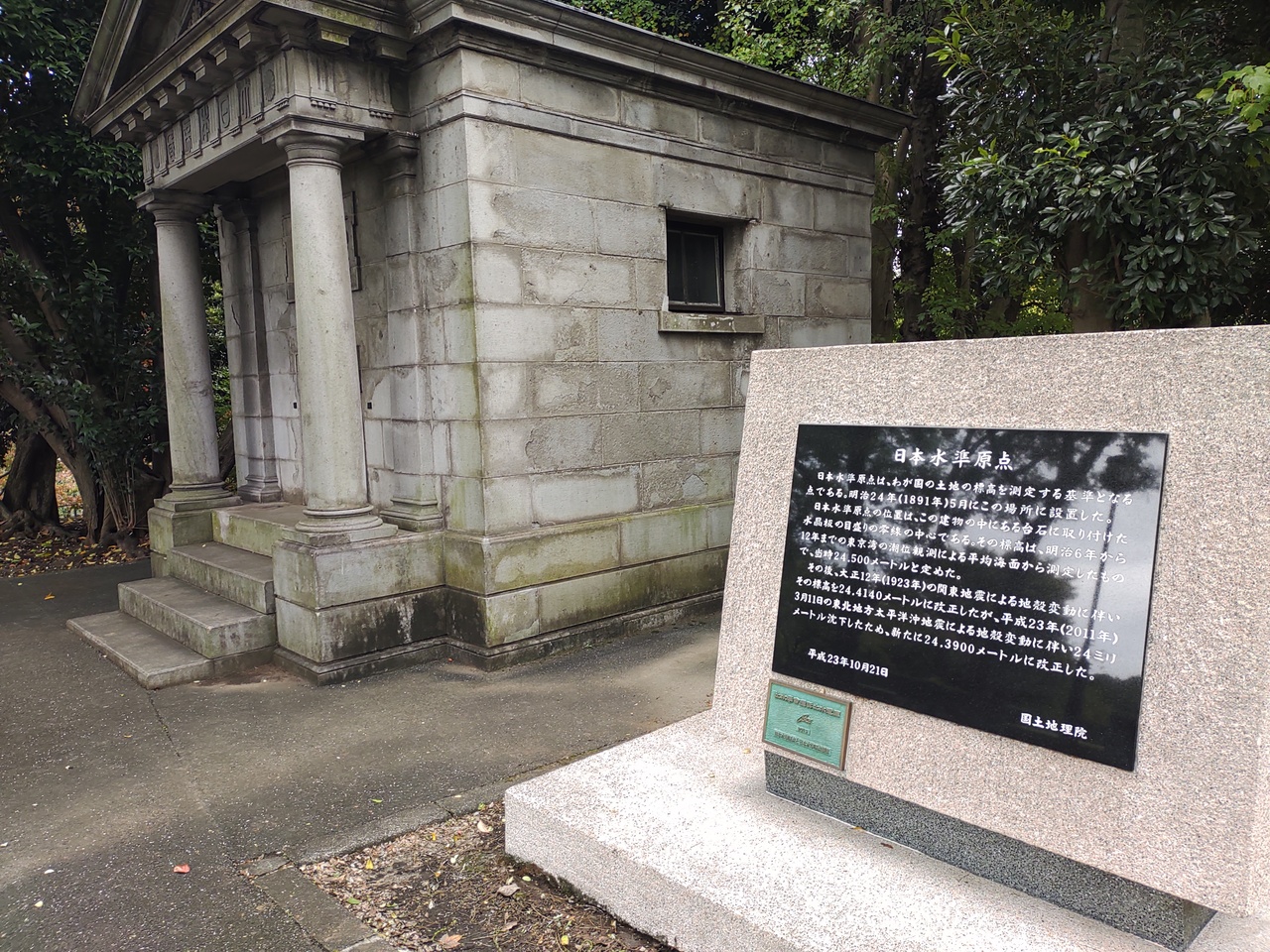 国土地理院の説明によると1891年に霊岸島で行われていた潮位観測(6年間の平均値)と霊岸島からこの地までの高さの観測(水準測量)結果を用いて、この建物内部の水晶板目盛りの0表示の高さを東京湾平均海面上24.500mとした。 閉じる投稿日:2022/12/28