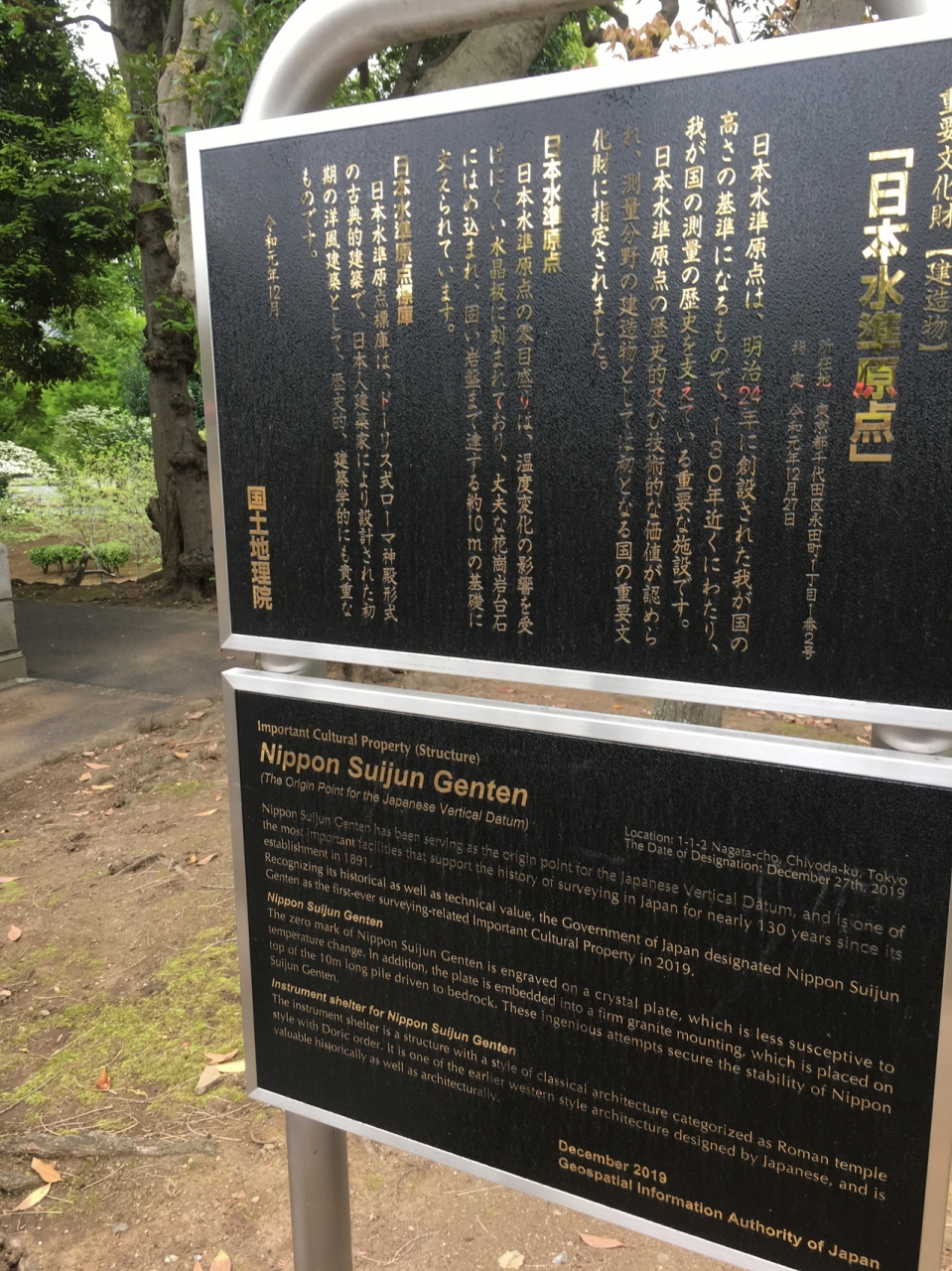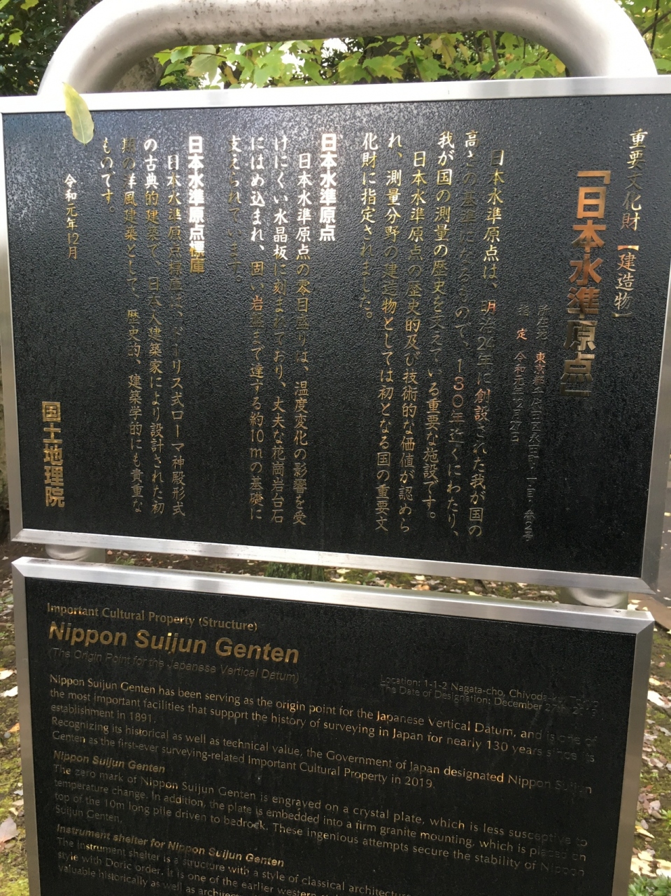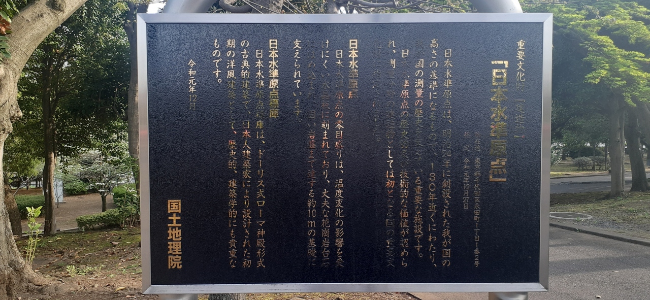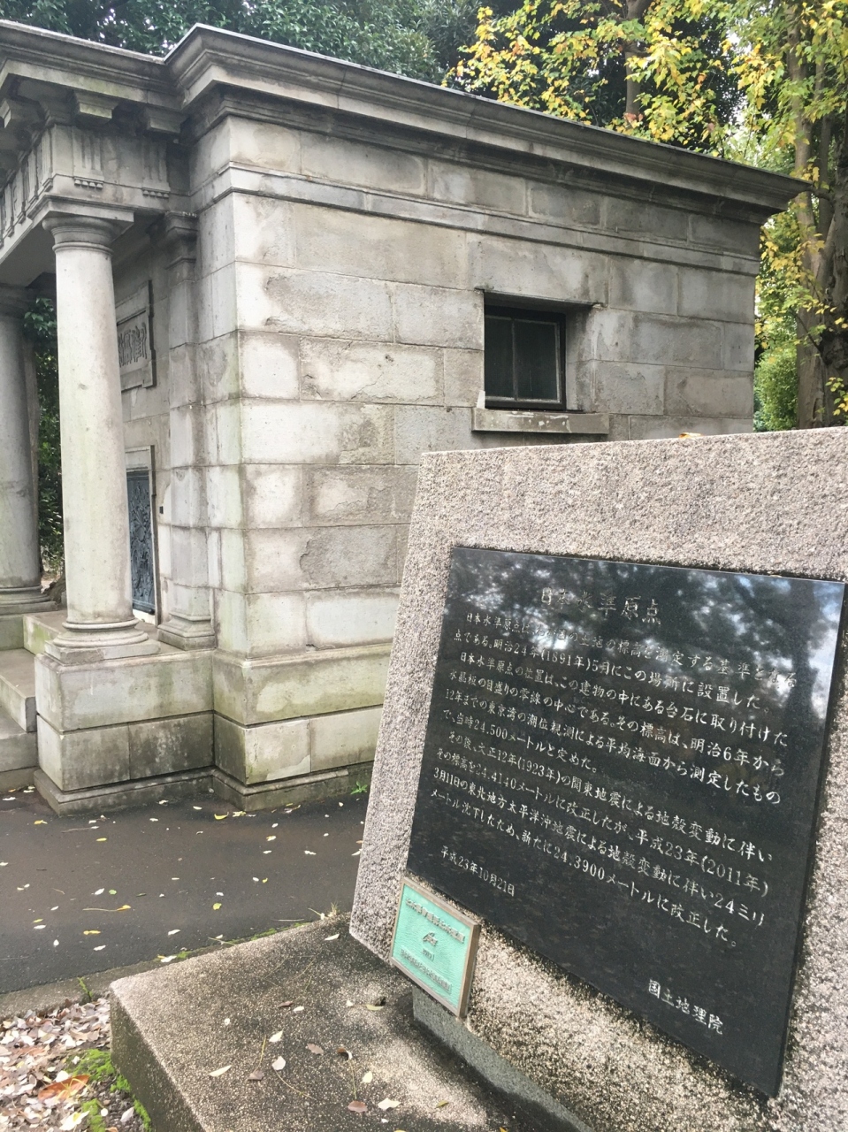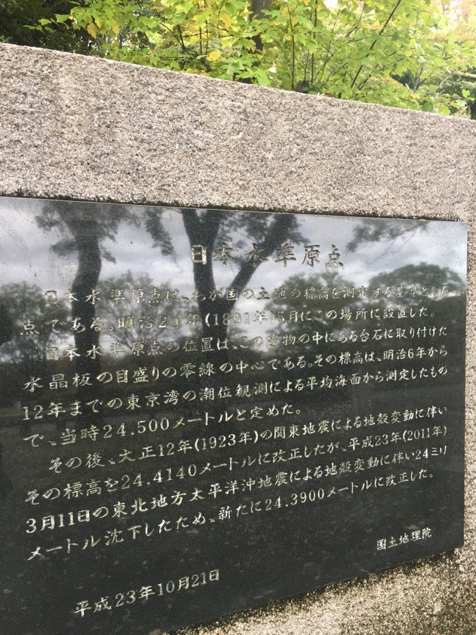 国土地理院の説明によると1891年に霊岸島で行われていた潮位観測(6年間の平均値)と霊岸島からこの地までの高さの観測(水準測量)結果を用いて、この建物内部の水晶板目盛りの0表示の高さを東京湾平均海面上24.500mとした。 閉じる投稿日:2022/12/28