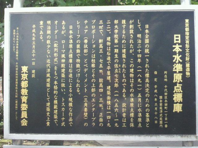 「国会議事堂」正面、銀杏並木の続く美しい道の両側には「国会前庭」が南北に分かれて広がります。その北側の地区は、かつては加藤... 続きを読む清正屋敷、その後は彦根藩主井伊家の屋敷、そして陸軍省と陸軍参謀本部のあった場所です。この「日本水準原点標庫」は、軍事上の必要性から陸軍参謀本部陸地測量部が明治24年に建てたものです。横に立つ案内板には、そのことについて一言も触れられていません。軍隊という言葉に、今も拒否反応があることを恐れているかのようです。かつて確かに存在し、時として大きな力を発揮した陸軍参謀本部。その事実を事実として認め、その遺構として大切に保存してもらいたいものですね。、 閉じる