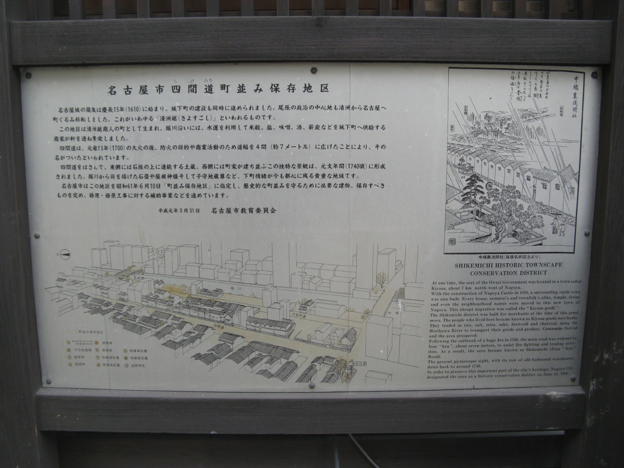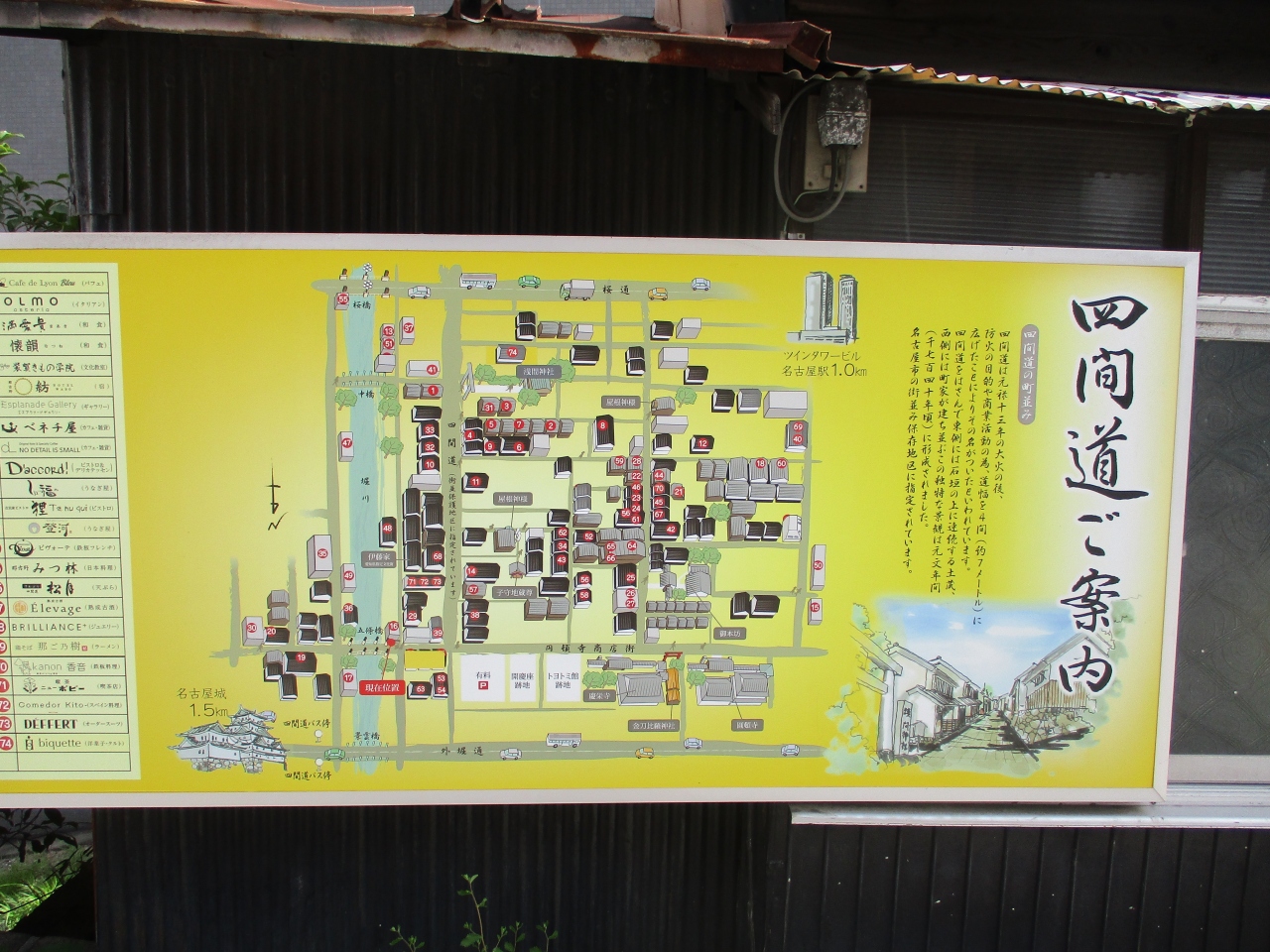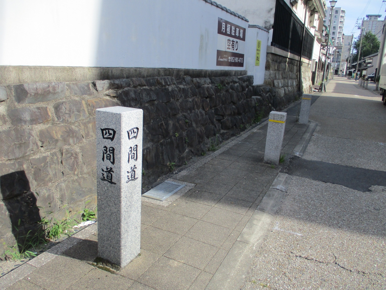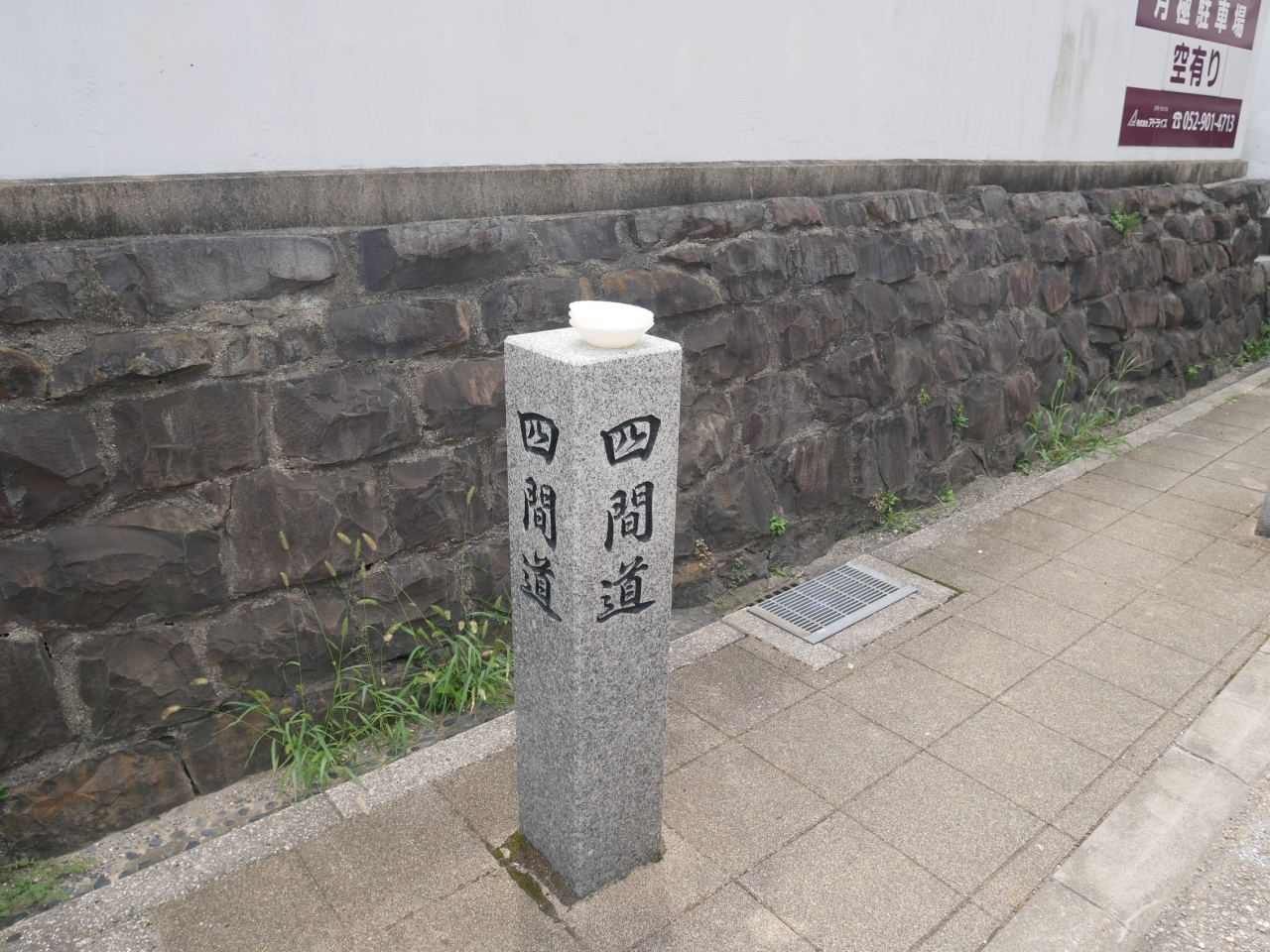江戸時代の大火でこの地区が焼失したあとに現在の区画が造られ、防火の為に四間の幅をとった道を造ったから四間道と呼ばれるそうです。だいたい7mの幅で現在ではそう広い道ではないですが、江戸時代の路地としては格段の広さだったようです。また防火の為に建築も土蔵を造る事を当時の尾張藩が奨励した結果今のような街並みが出来上がったそうです。