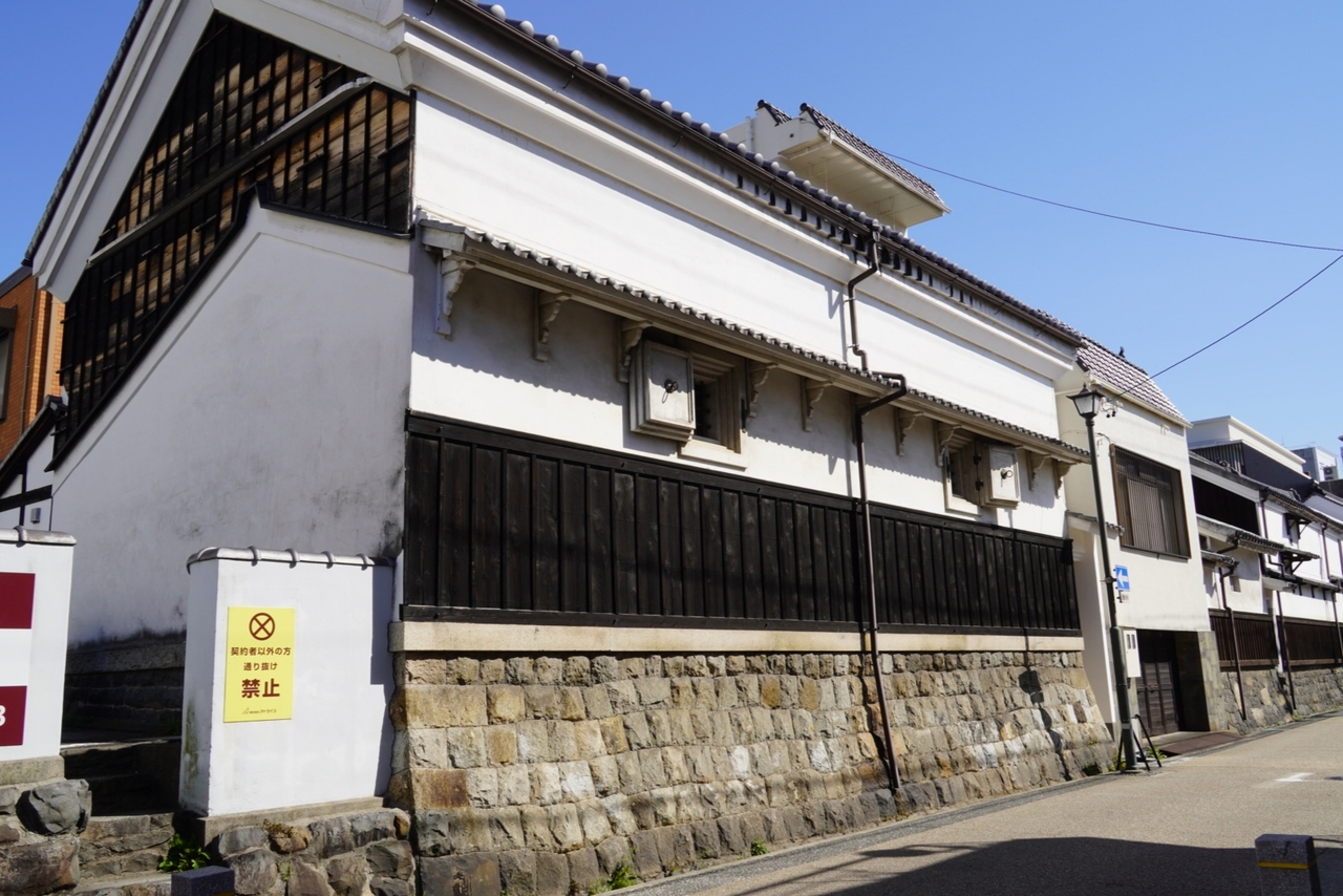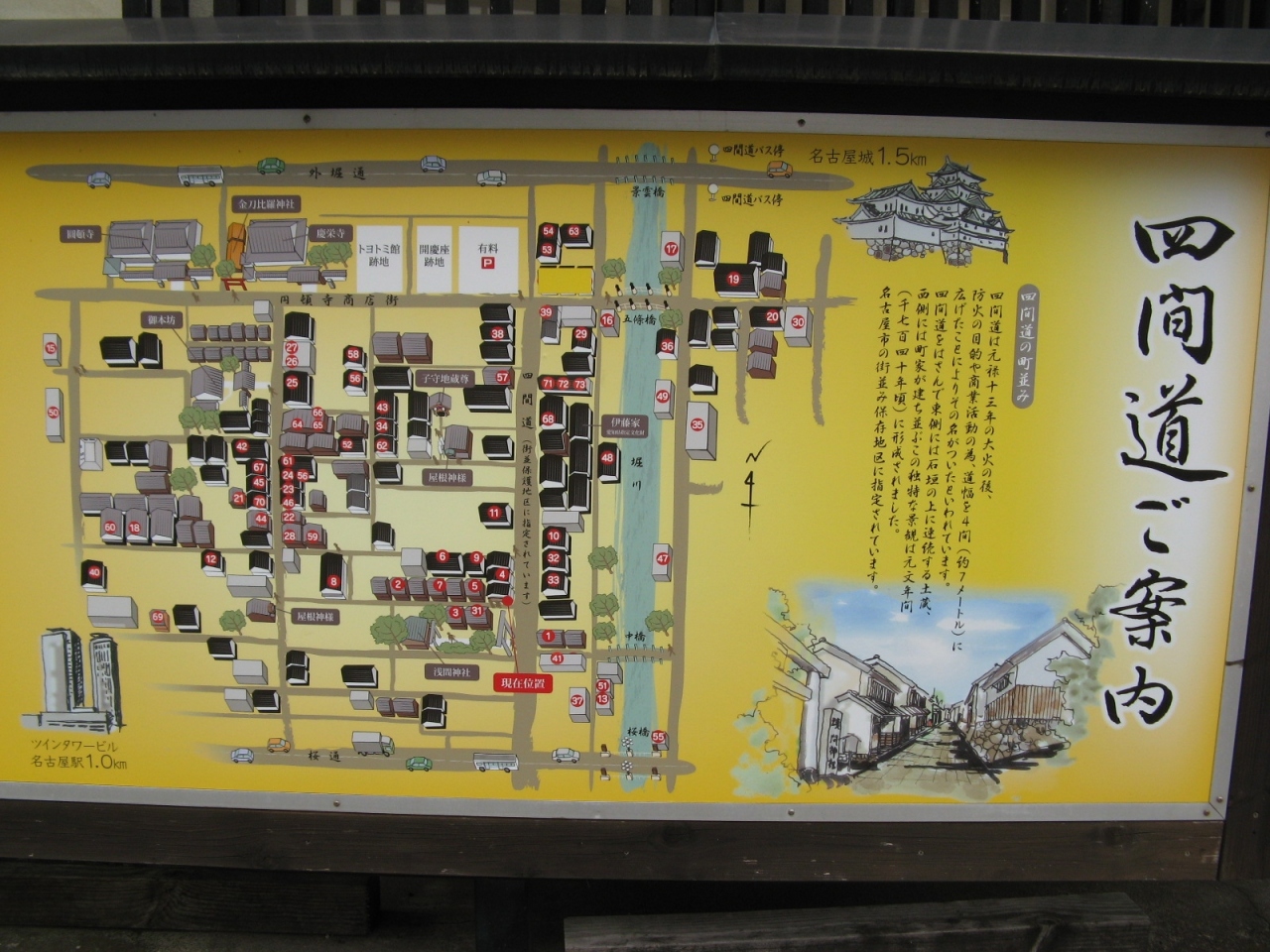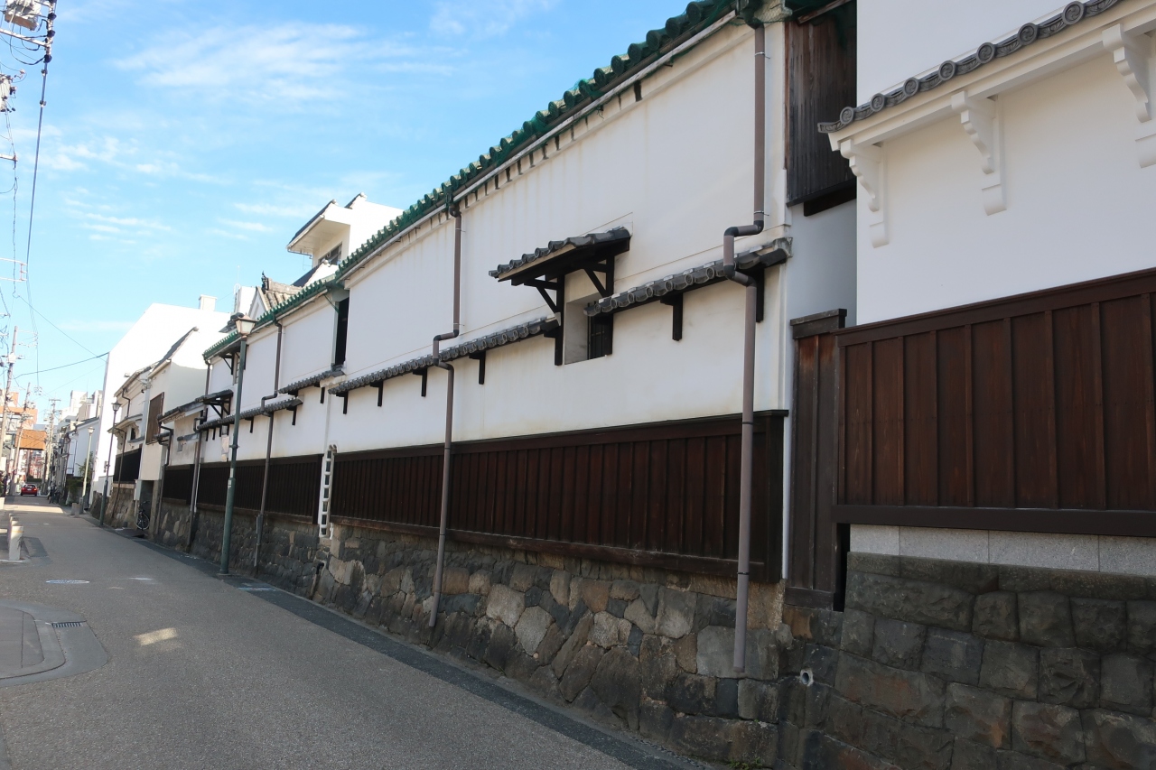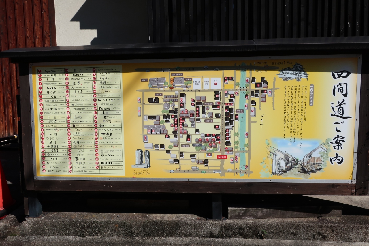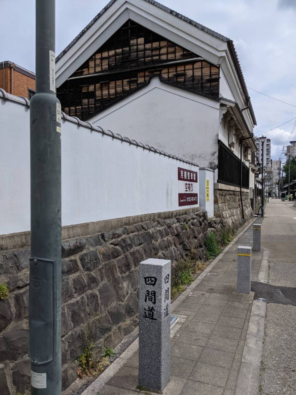 江戸時代の大火でこの地区が焼失したあとに現在の区画が造られ、防火の為に四間の幅をとった道を造ったから四間道と呼ばれるそうです。だいたい7mの幅で現在ではそう広い道ではないですが、江戸時代の路地としては格段の広さだったようです。また防火の為に建築も土蔵を造る事を当時の尾張藩が奨励した結果今のような街並みが出来上がったそうです。