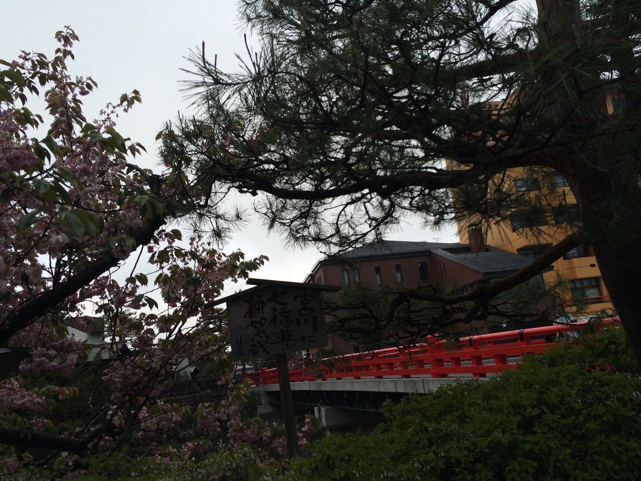 満開桜の巨木と赤い欄干・宮川の流れが素晴らしい