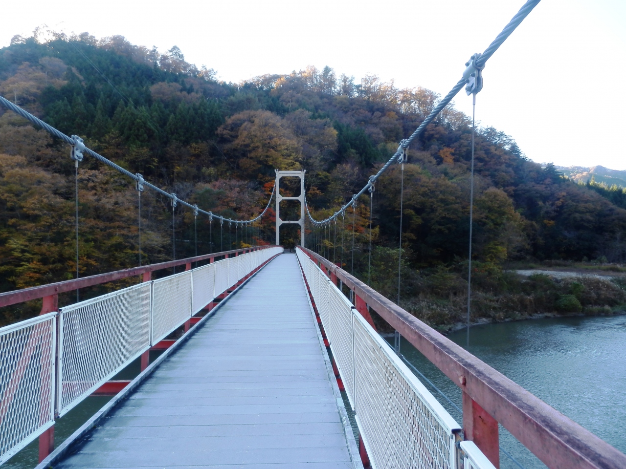 赤い吊り橋が景色に映えます