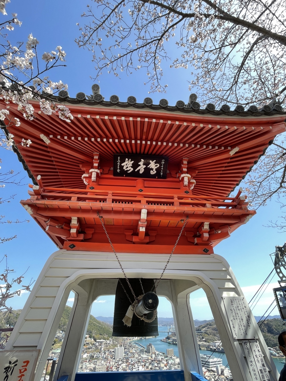 「千光寺公園」から歩いて10分ほどで「千光寺」に到着しました。「三十三観音堂」から「除夜の鐘」としてひろく人々に親しまれ、...  続きを読む尾道の名物の一つにもなっているという、朱塗りの「鐘楼」、弘法大師様をお祀りしている「大師堂」、崖に突き出して立つ朱塗りの「本堂」と順番にお参りすることができました。  閉じる