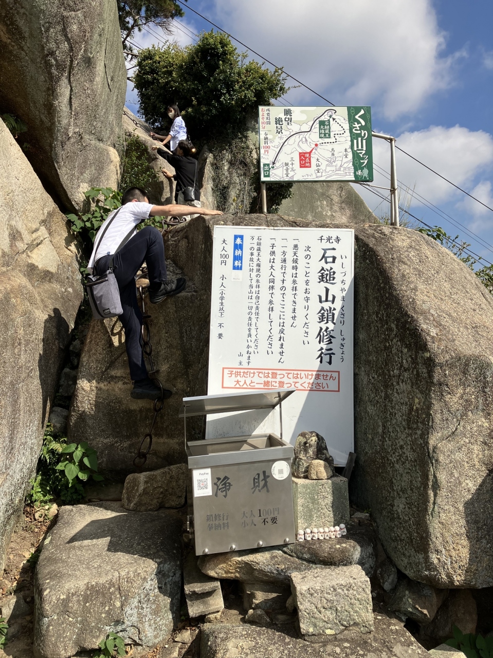 険しい岩山が聳え、斜面に鎖が這っています。この鎖を伝って岩山を登っていくと、石鎚蔵王大権現。社からは絶景が望めるといいます。