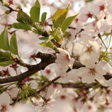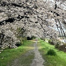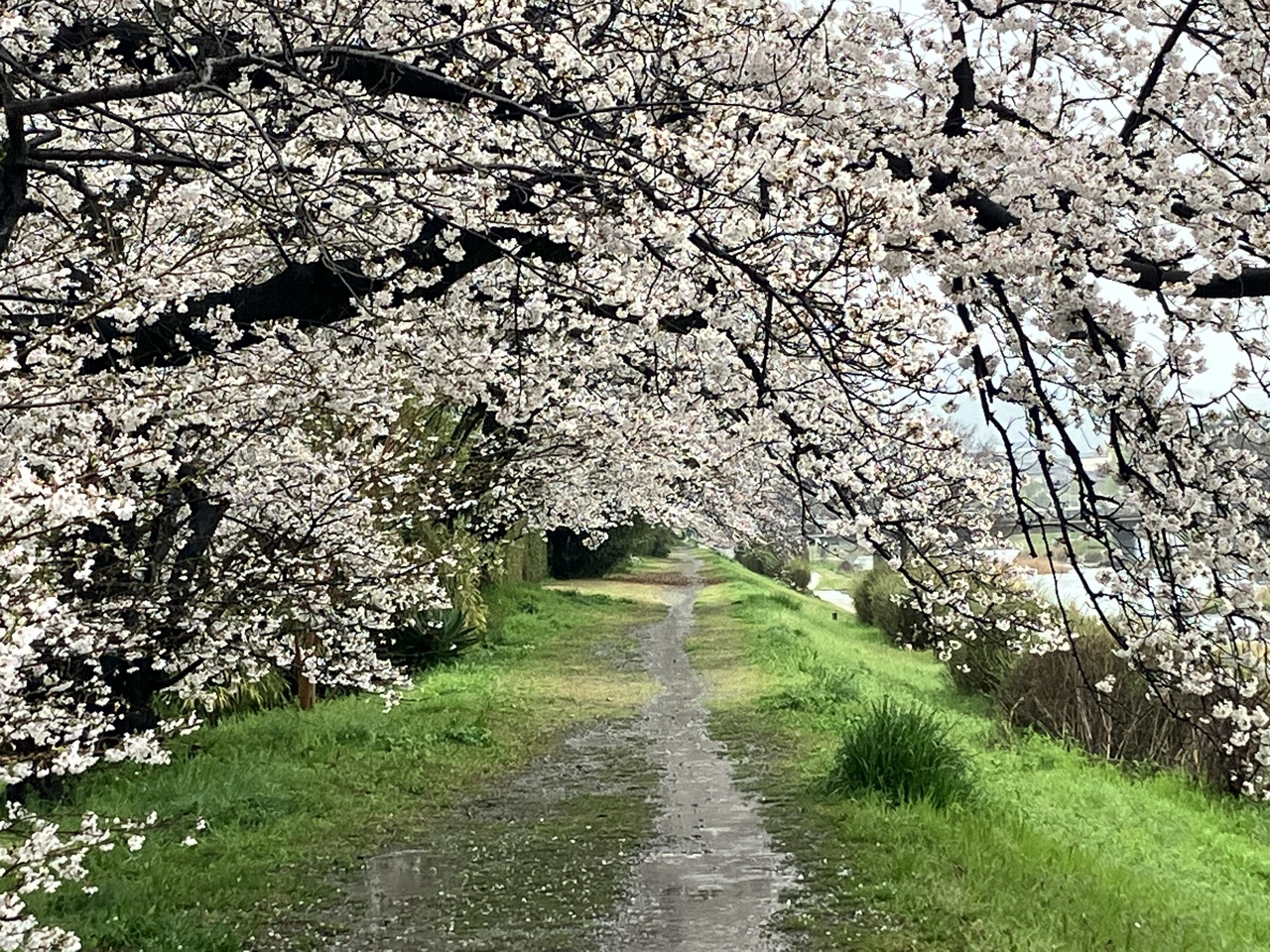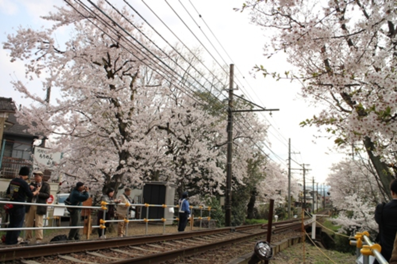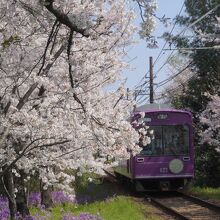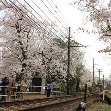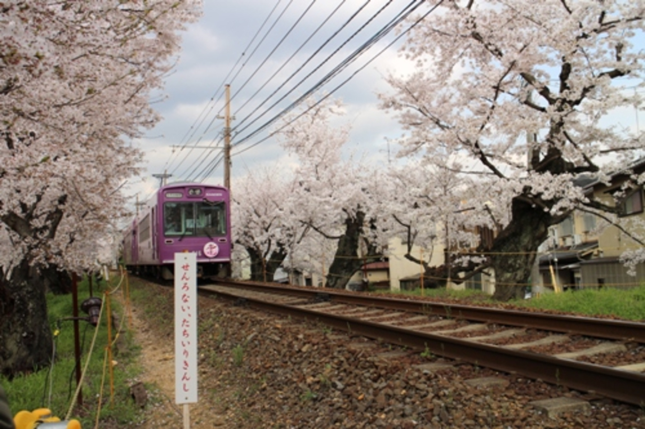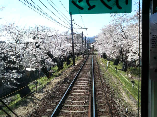 列車の最後尾の窓からゆっくり桜を眺めました。