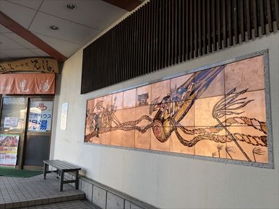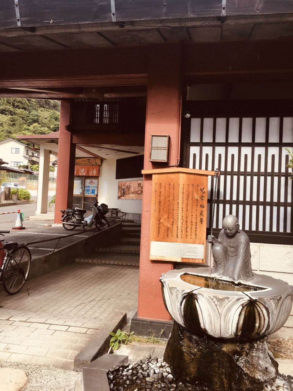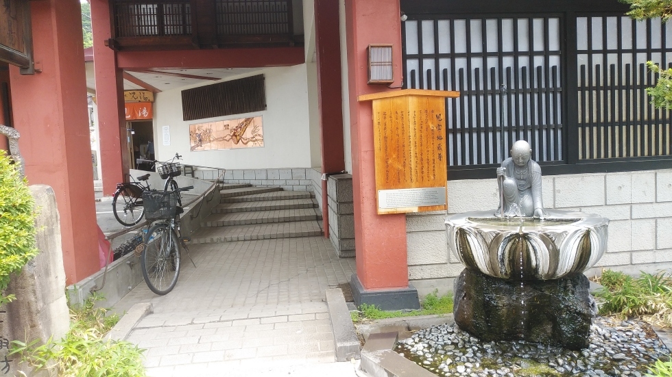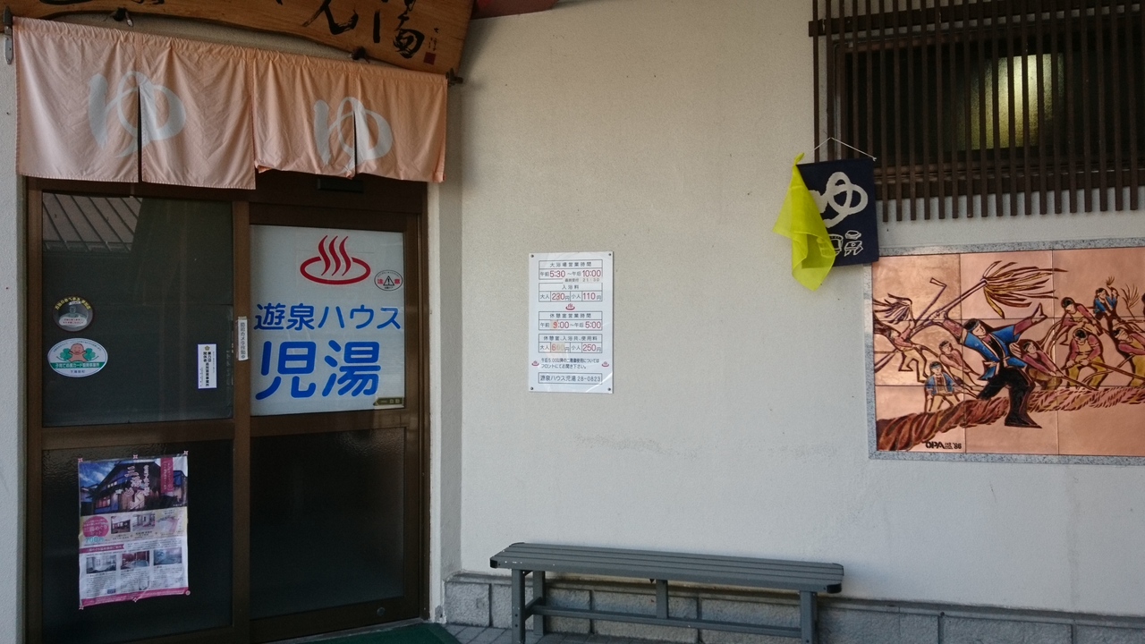 玄関を入ったフロントで料金220円を払い、脱衣場の入り口にソファーのあるロビーがあり、脱衣場には100円返却式のロッカーもあります。浴室は、L字型のやや熱めの広い温泉と、打たせ湯があり、扉の外には、狭いながら露天風呂もあります。共同浴場と同じ料金ですが、設備は良いので観光客向けです。露天風呂につかって、しばしのんびりとして、湯上りはロビーのソファで地元のローカル新聞を読んでくつろぎました。