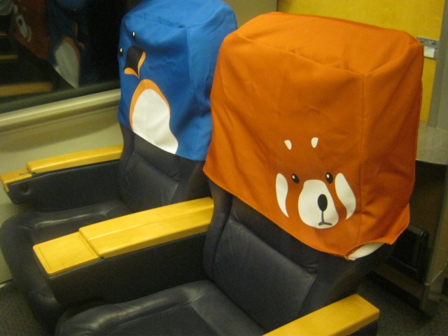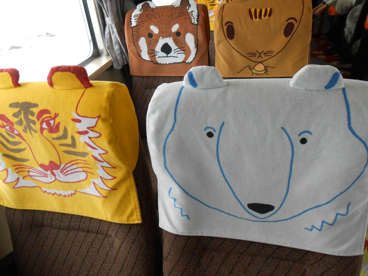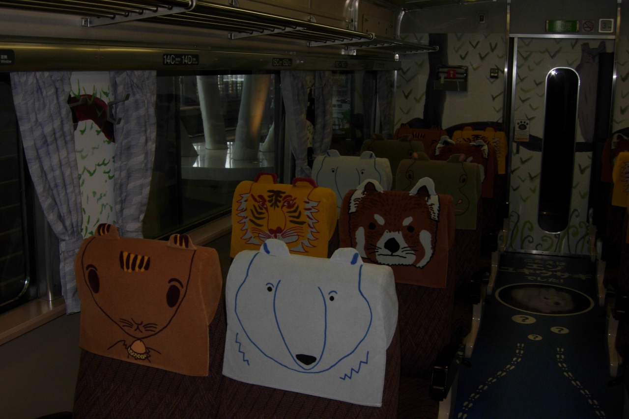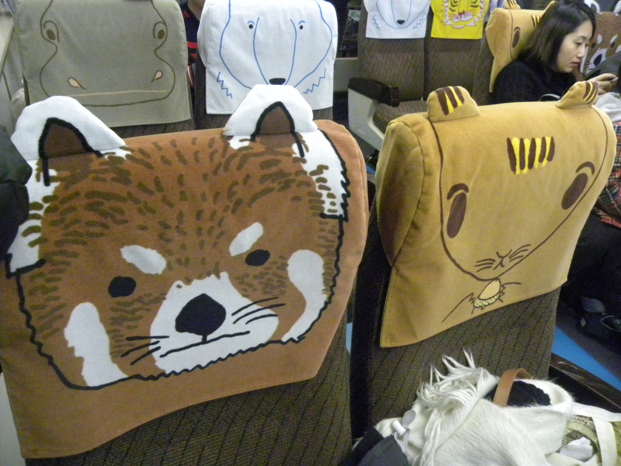 新号も通常の車両に関しては、至って普通のライラック車内なので、最初はどこが動物園?なんて思いましたが、どうやら新号では、グリーン車を写真撮影スポットとして開放するのですが、その都度、スタッフの方がカバーを掛けたりして、”動物園仕様”にしているんですね。なので、発車からしばらくは準備時間のため待たされることになります。