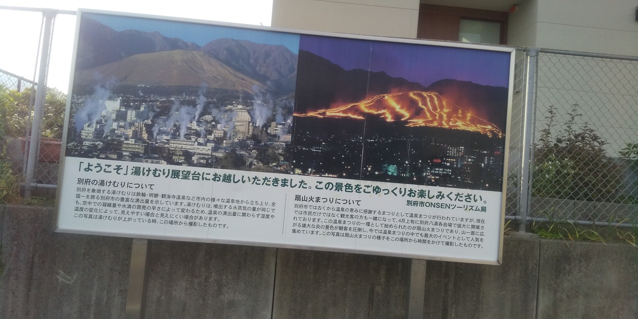 別府市観光で立ち寄りました。湯けむり展望台は、別府の湯けむりを楽しめる場所で、貴船城入り口バス停から歩いて10分強で着きま... 続きを読むす。確かに湯けむりがくっきり見えました。扇山が正面に見え、展望台の説明板に「扇山火まつり」の写真が展示されてます。説明板の左の写真の茶色い部分が、右の写真の様に火の龍がうねる様な景色になるそうです。 閉じる