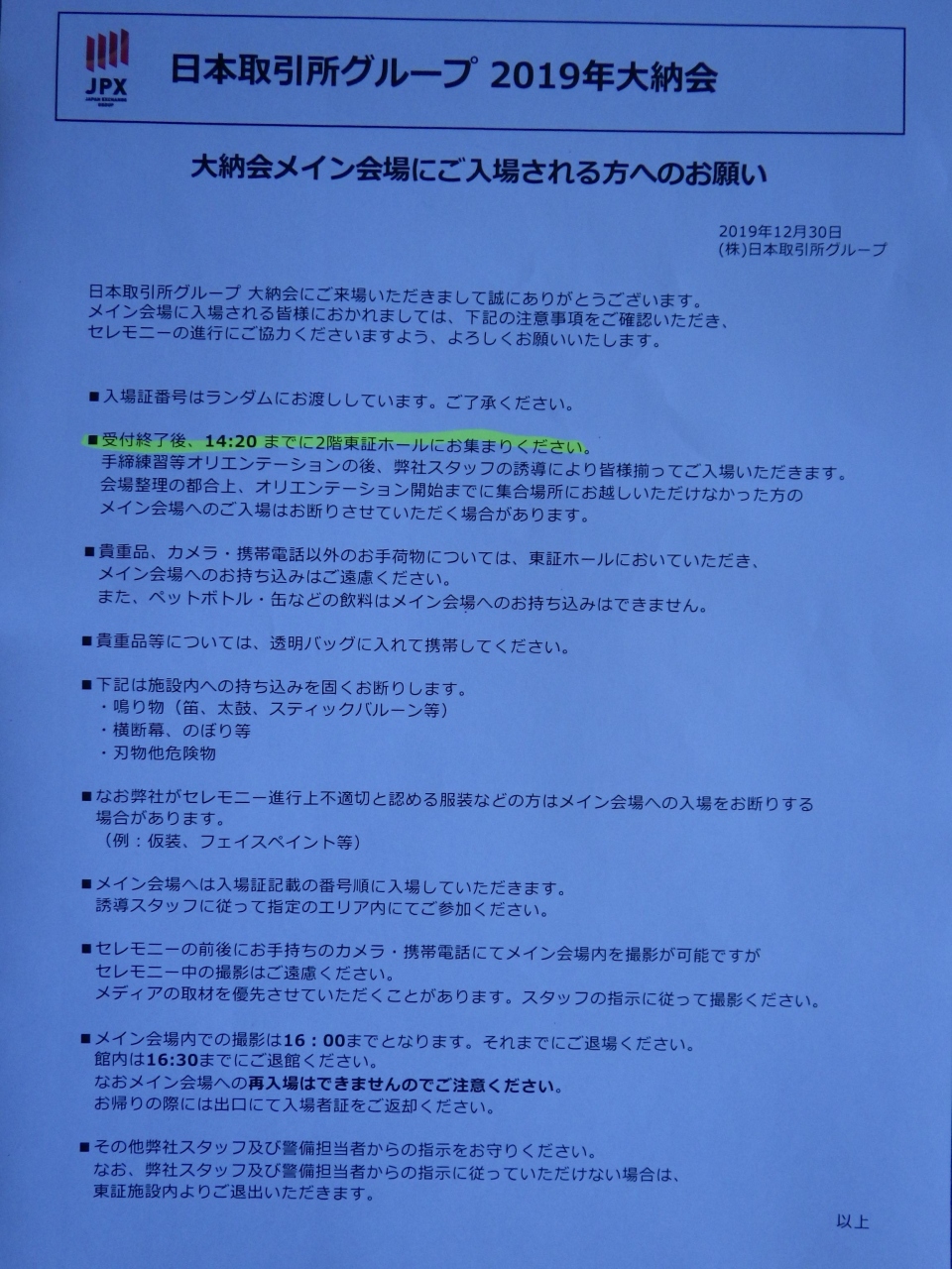 東証からのメールで大納会・大発会の参加者募集(抽選)を知り、とりあえず、野村萬斎氏がゲストの大納会にダメ元で申し込みました... 続きを読む。その結果、当選。時折、小雨が降る中、行ってきました。一般参加者約90名。