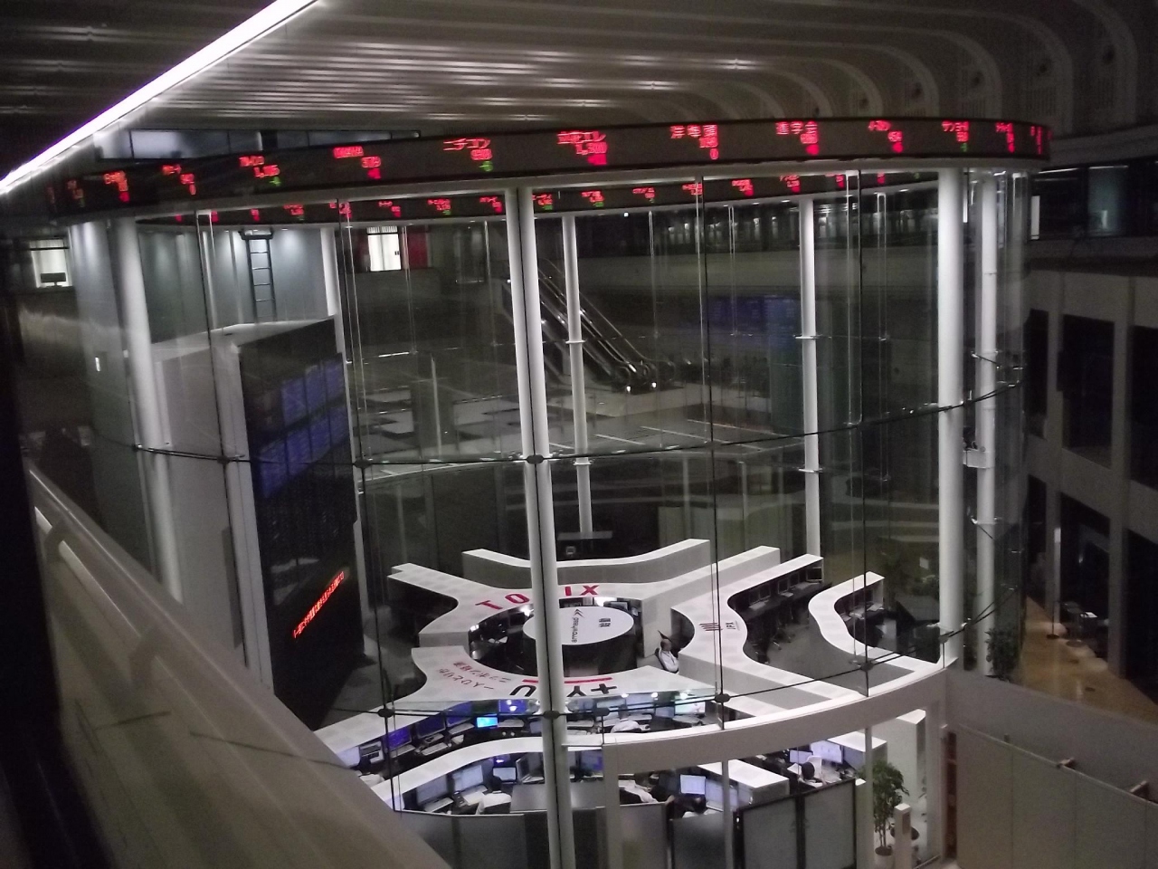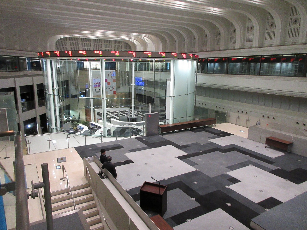 近頃の証券取引は電子化が進み、証券取引所の至近にコンピュータがある方が有利と言う程のスピード勝負。その為現在の東証は、多くの証券マンでごった返すかつての証券取引所のイメージではなく、だだっ広い取引所の片隅に数名のオペレータが居る程度。