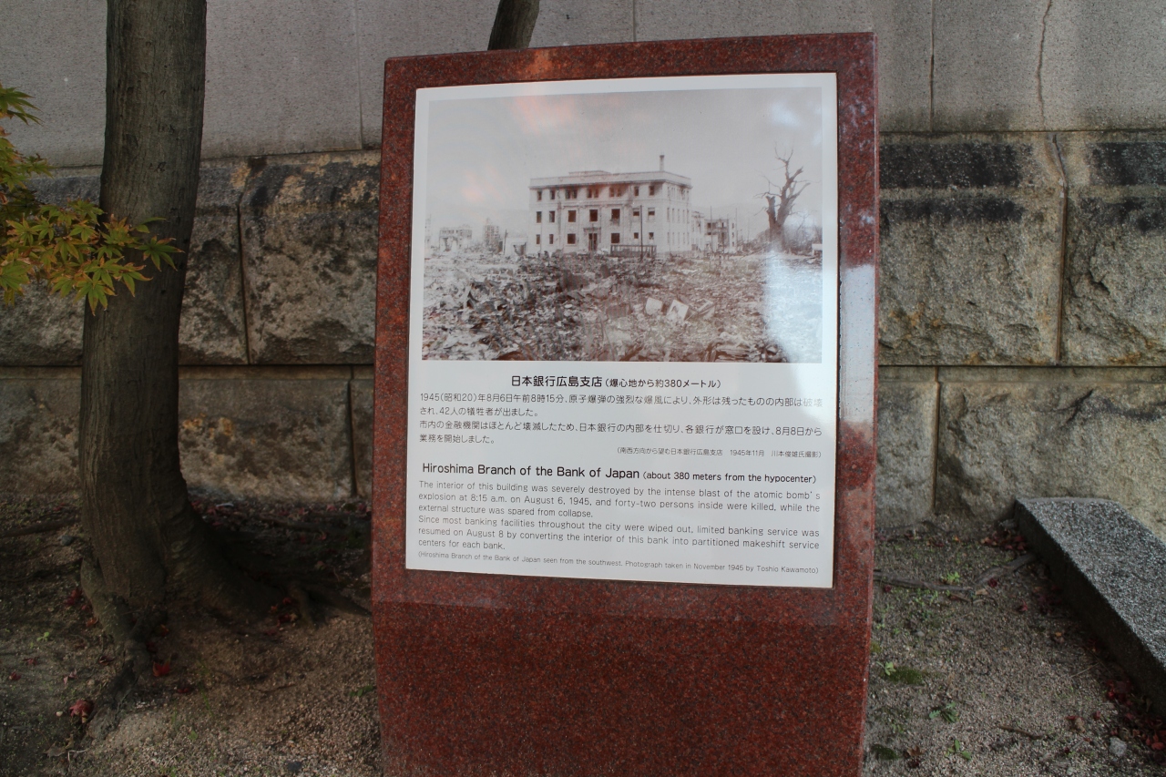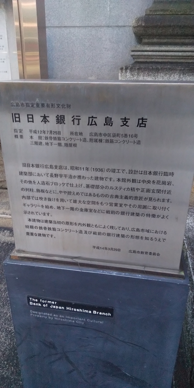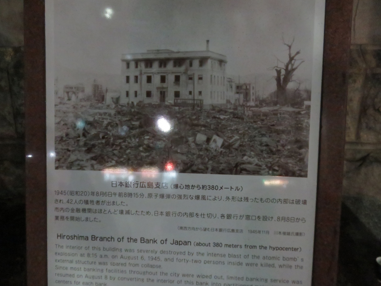 爆心地から380m 1936年(昭和11年)開業 被爆当日は、負傷者の臨時病室として使われ、被爆から2日後の8... 続きを読む月8日には被災した市民の為に、支払い業務を開始しました。 広島に現存する被爆建物の中でも抜群に保存状態がよい建物となっています。 一部資料室となっている事と、中々銀行の内部を見る事が出来ないので寄ってみましたが、何だかとてもハイカラでオシャレです。 時代的なものなのか、銀行内部特有の物なのか、何のためにあるのか分からないものもありました。 中は撮影禁止のところも多いので、写真は余りありませんが、支店長室には原爆により窓が飛び散り、それによってできた壁の傷が生々しく残っていました。 銀行内で亡くなられた犠牲者の方々に、ご冥福をお祈りいたします。 閉じる